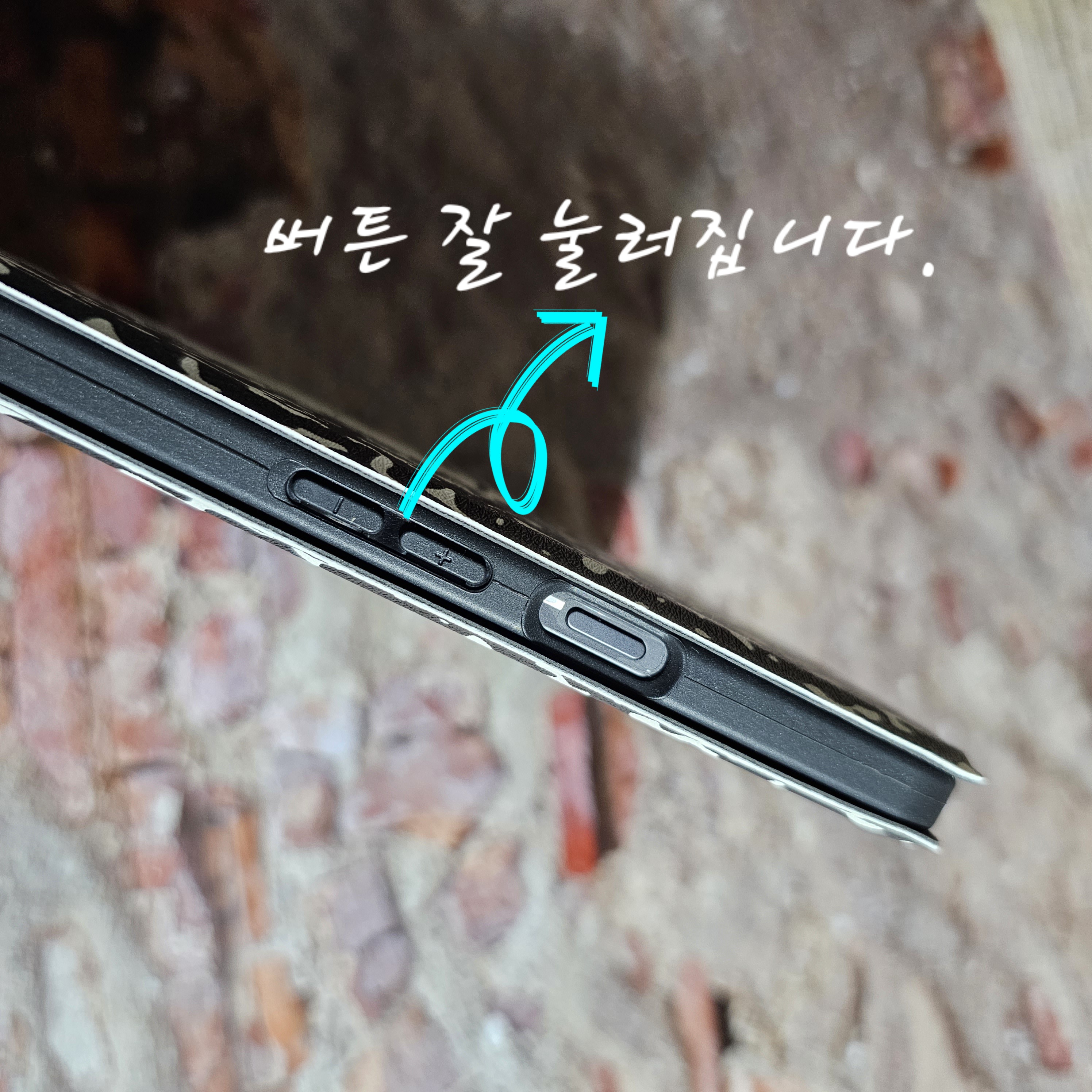 스피커, 전원 버튼, C-type 충전 단자 부분은 크기에 맞게 재단 되어 있습니다. 볼륨 버튼은 잘 눌러집니다.