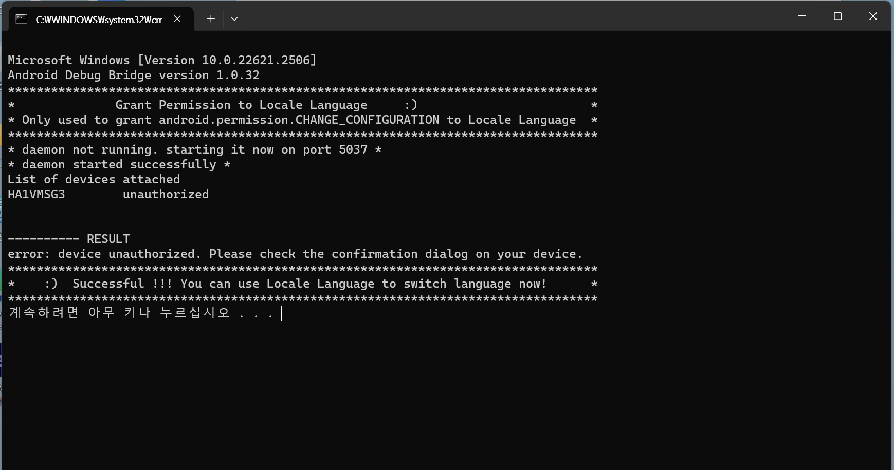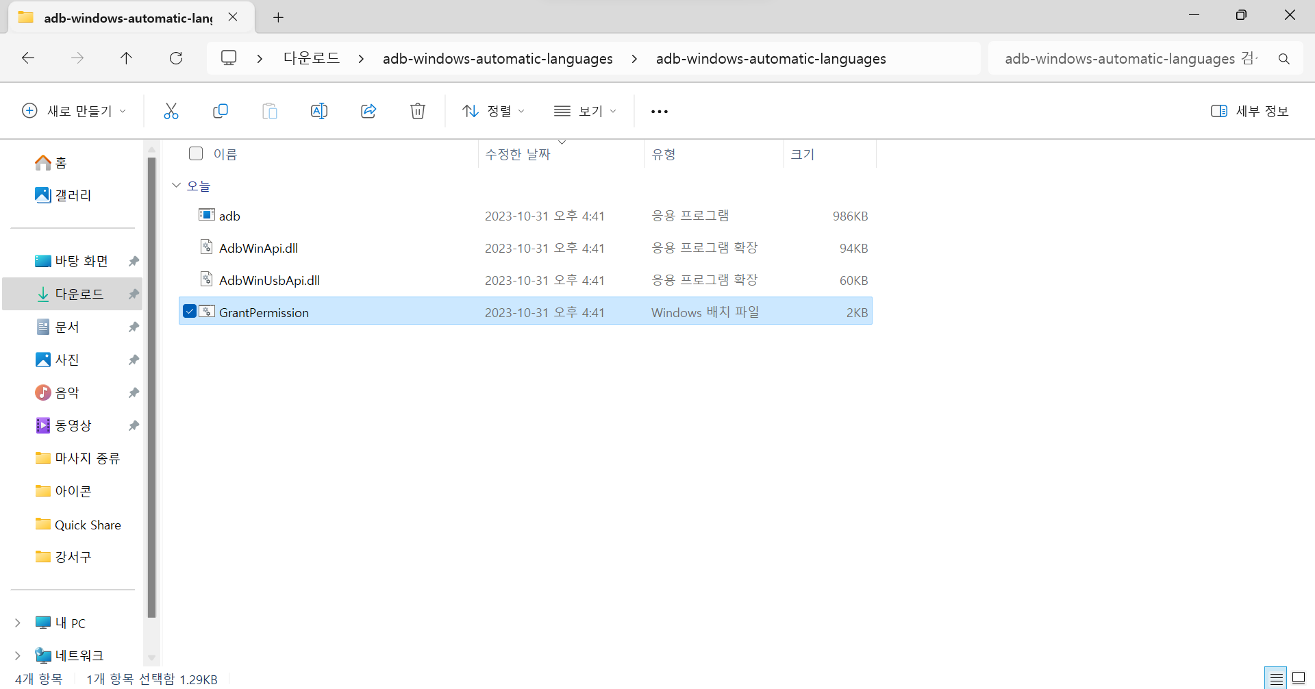 4. USB debugging Allow를 한 후 컴퓨터에서 다운로드한 adb-windows-automatic-languages.zip 압축을 푼 후 폴더 안에 있는 GrantPermission를 실행합니다.