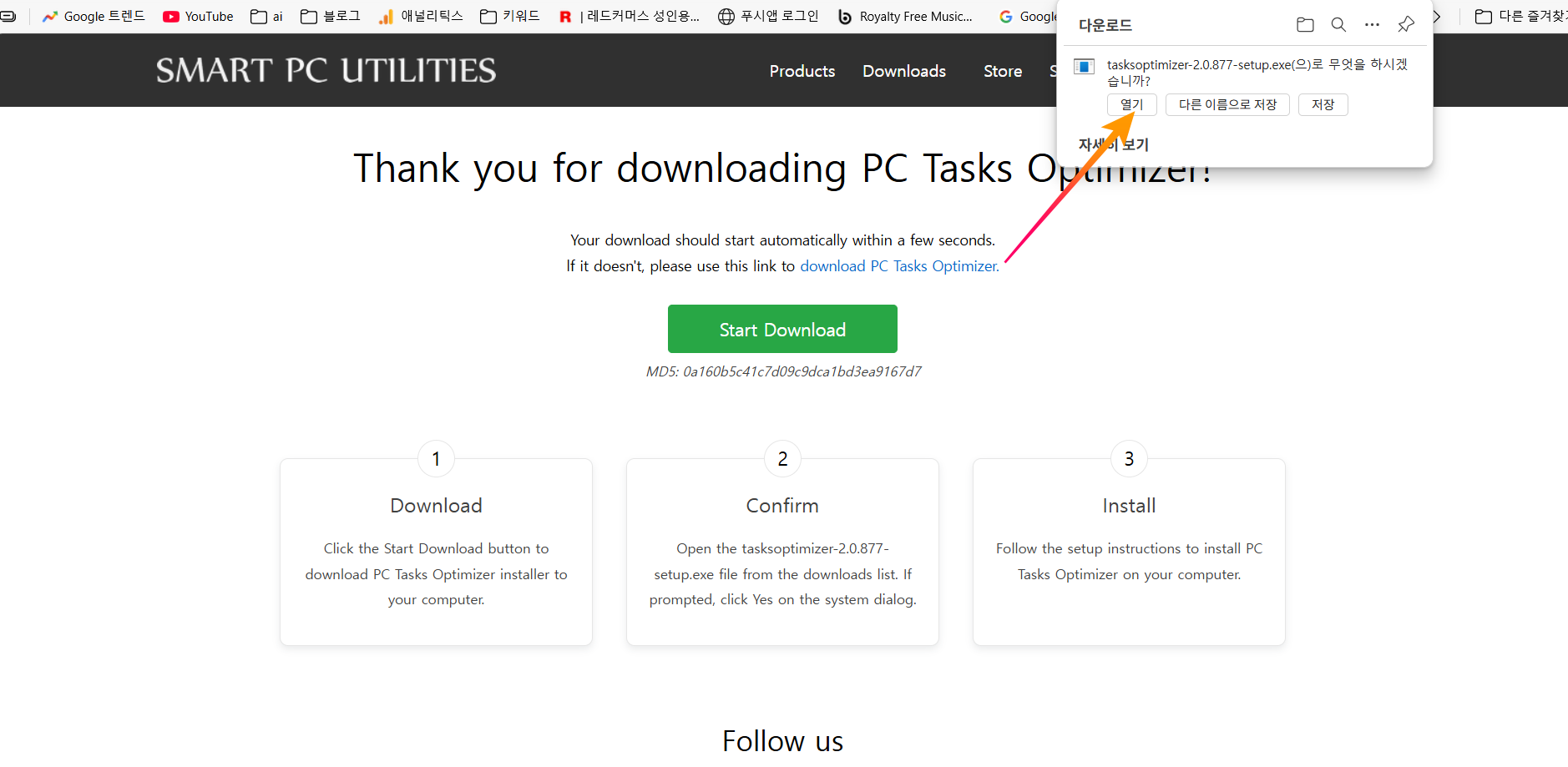 그다음 다운로드 창에서 '열기'를 클릭해서