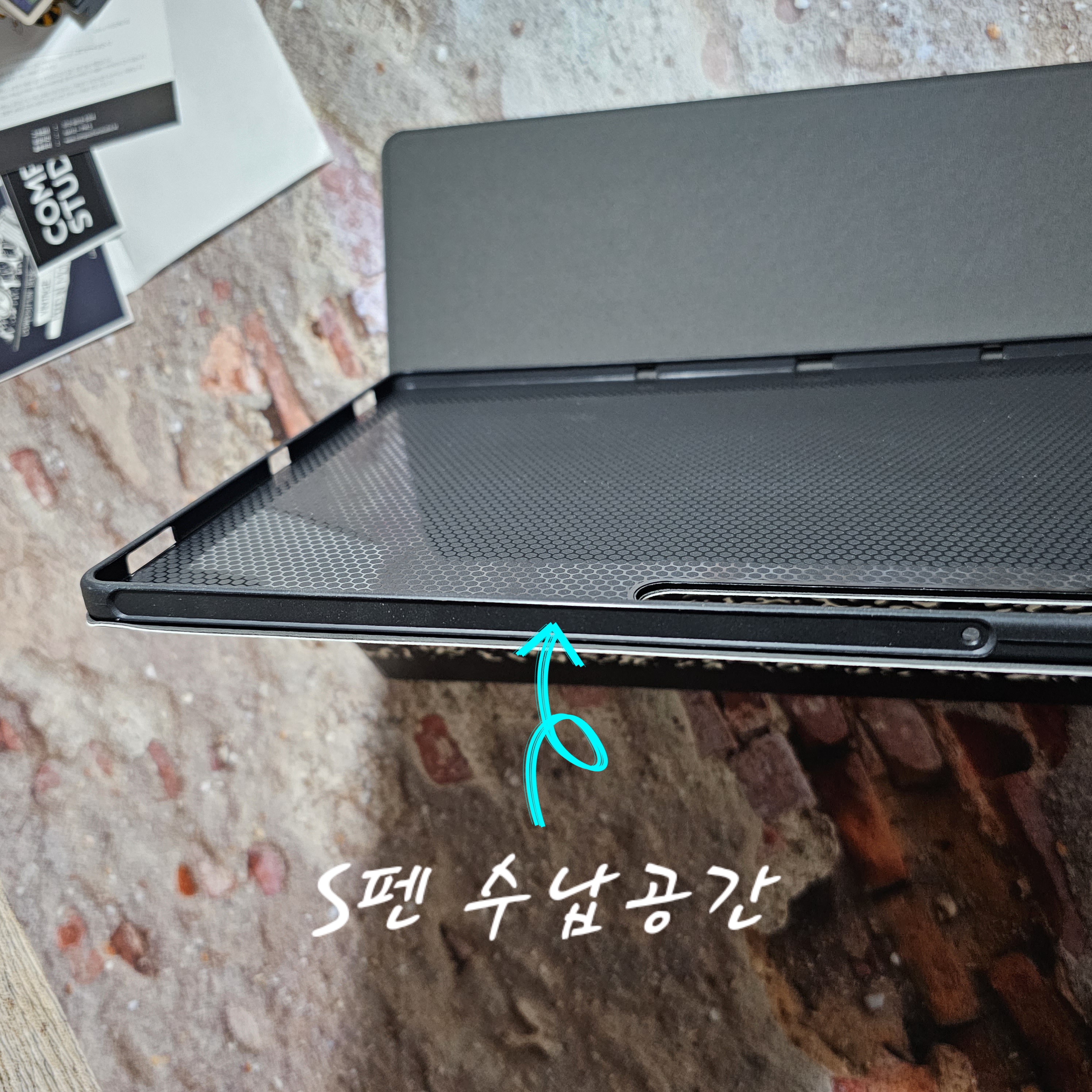 2. 케이스 옆면과 뒷면에 S펜을 자력으로 수납할 수 있으나 아이패드처럼 중간에 수납하는 공간이 따로 없습니다.