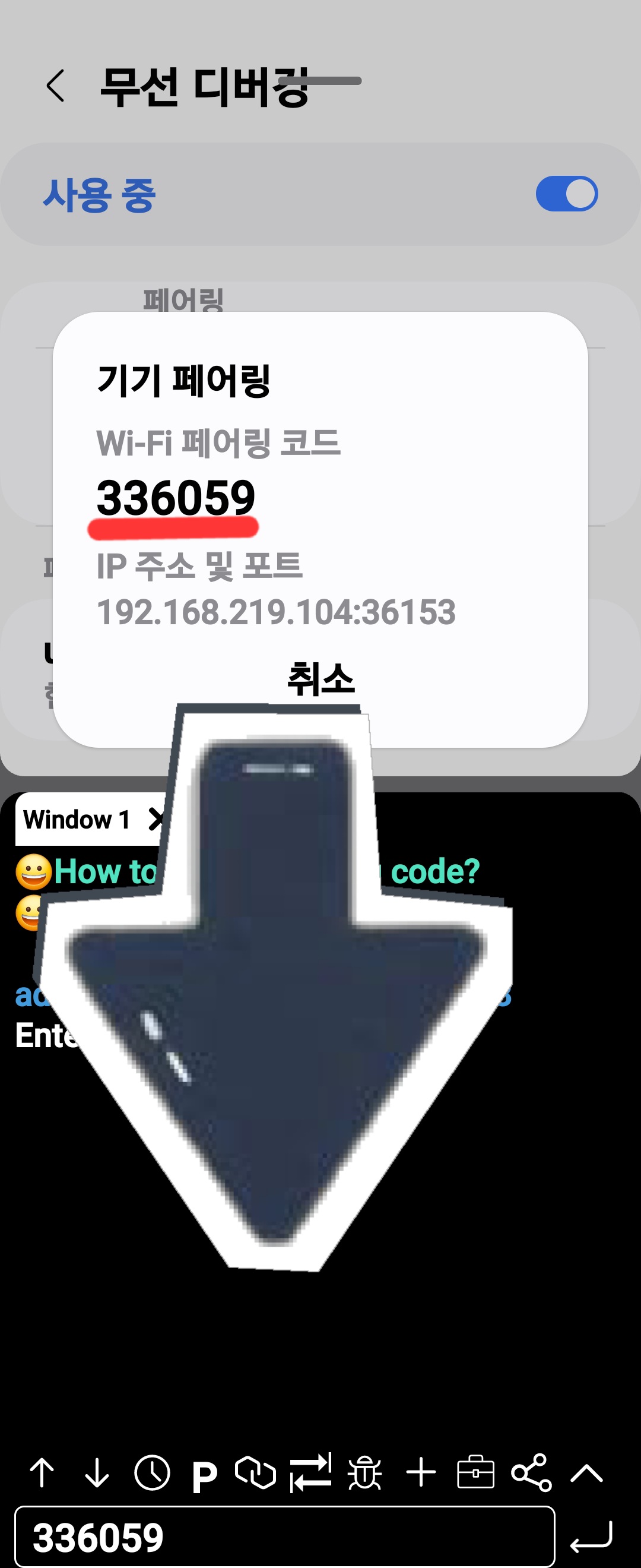 6. adb shell window창에서 WI-FI 페어링 코드를 입력합니다.