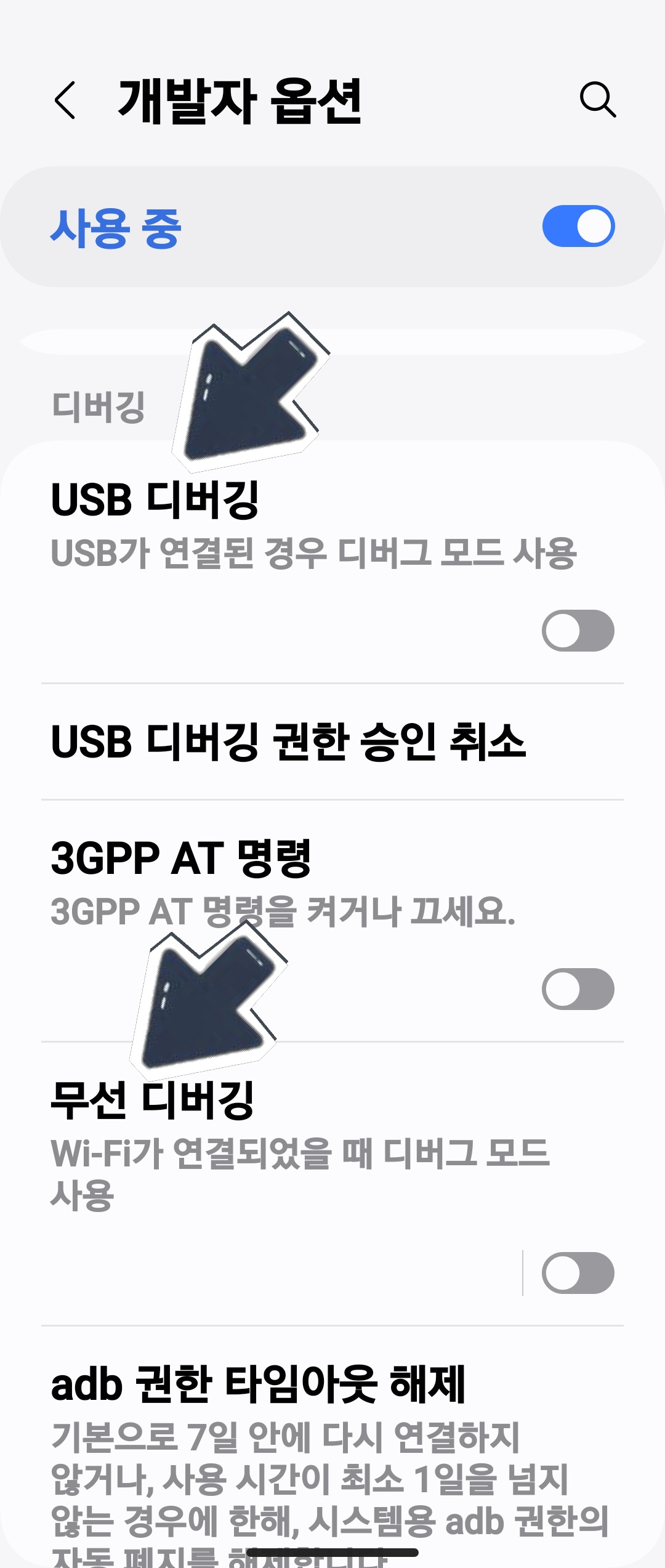 3. 개발자 모드에서 usb디버깅과 무선 디버깅 모드를 실행합니다.