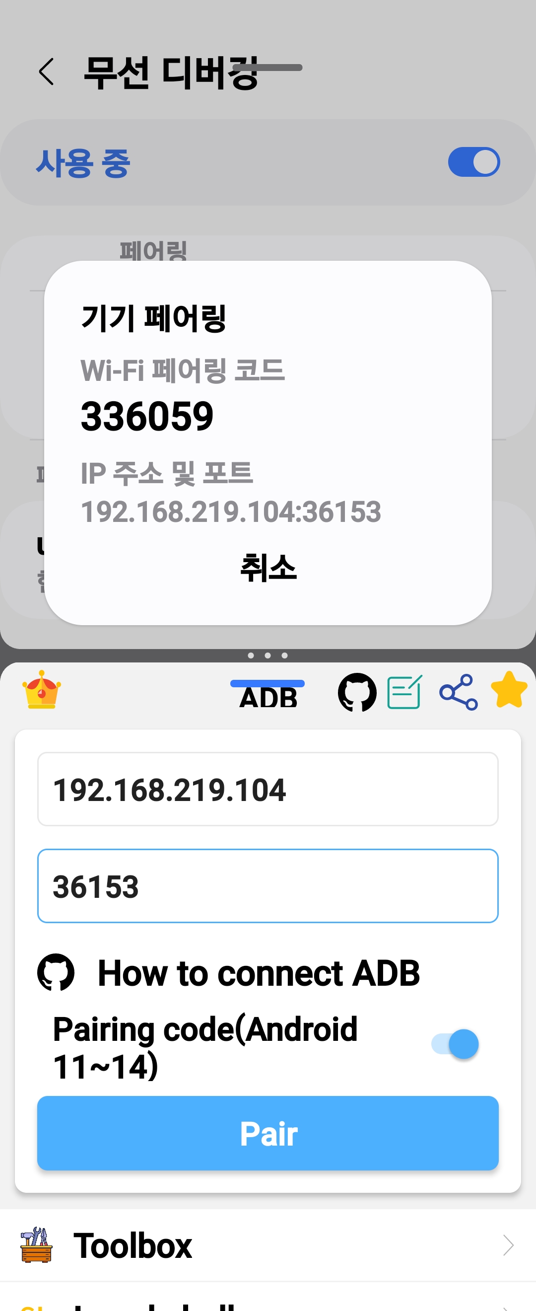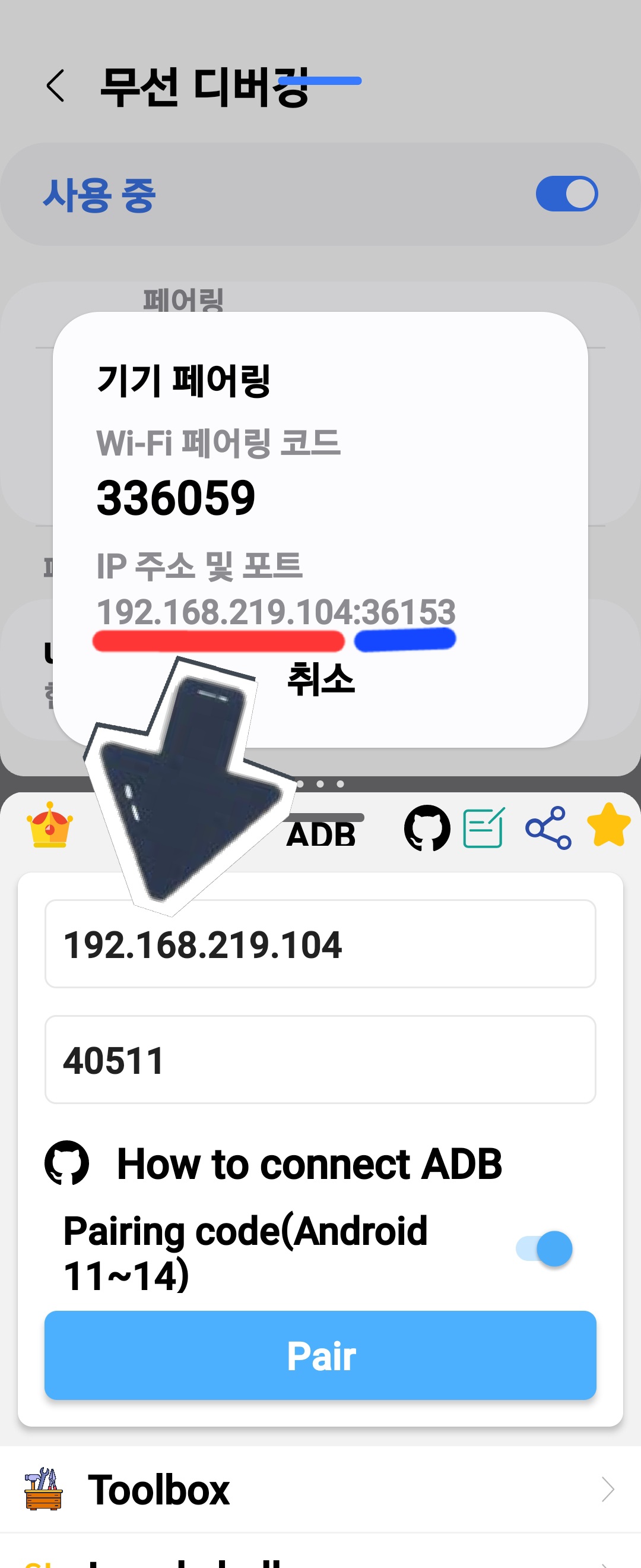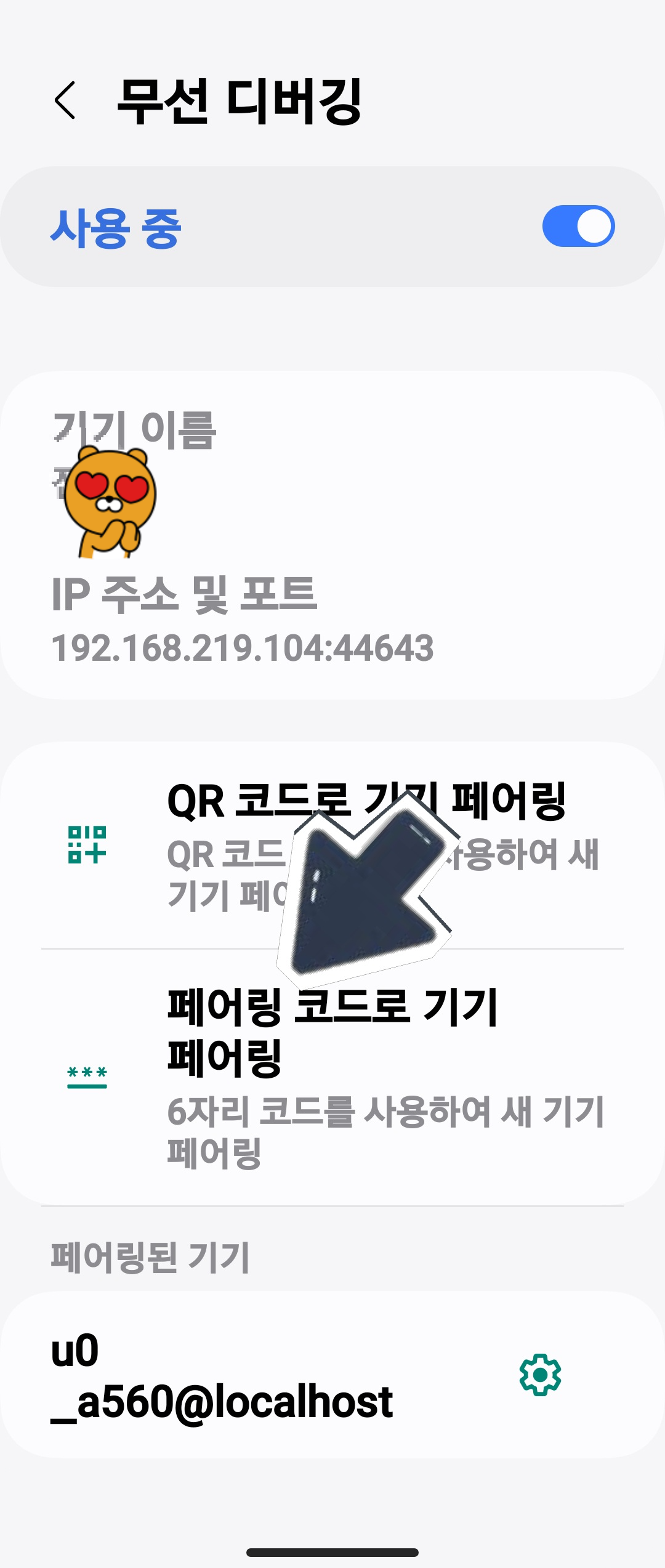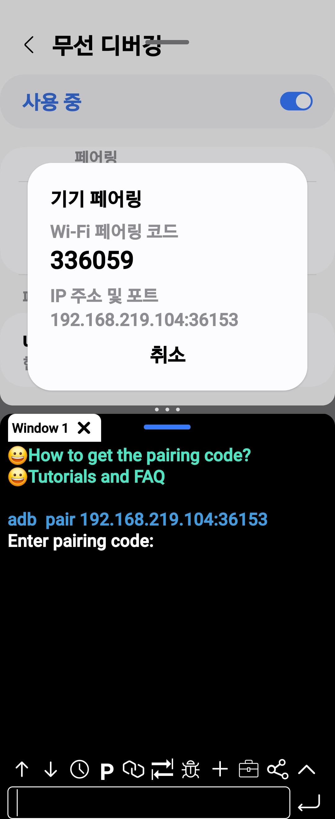 페어링 코드로 기기 페어링을 실행하면 IP 주소 및 포트 번호 Wi-Fi 페어링 코드가 생깁니다.
