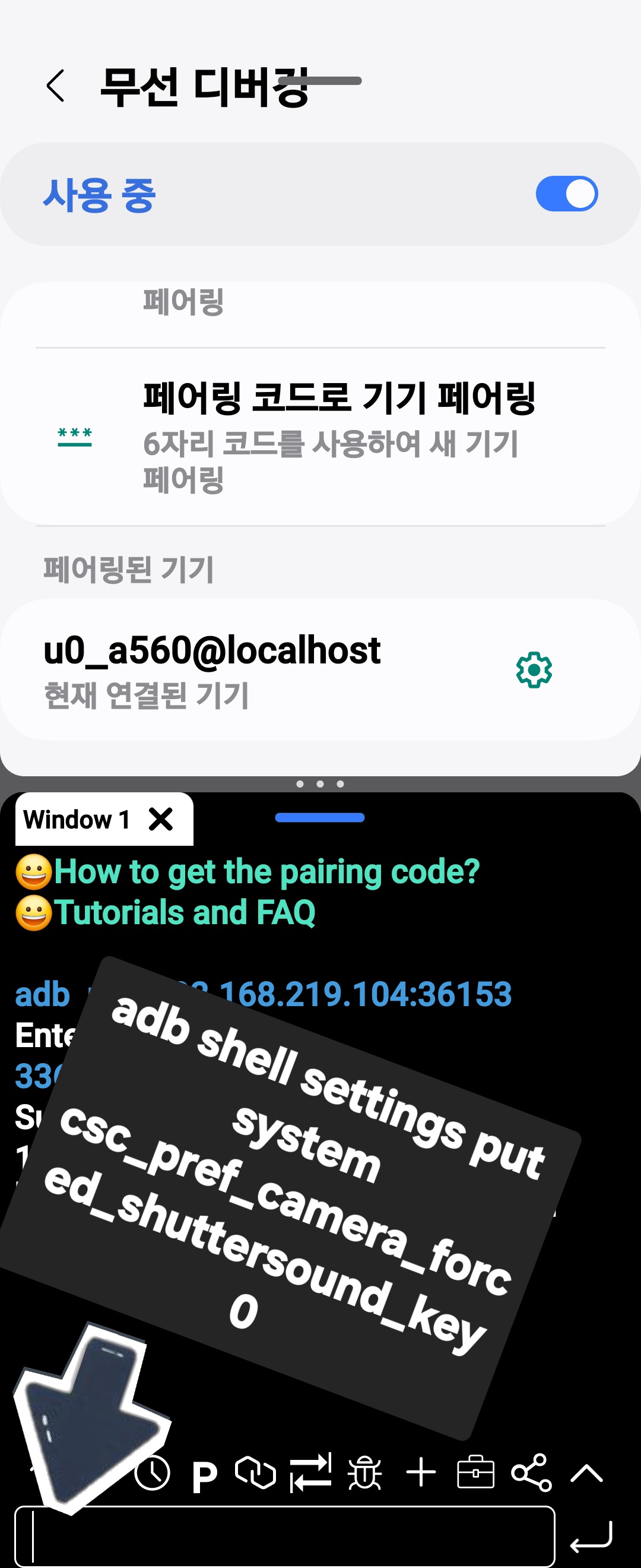 갤럭시 안드로이드폰의 경우 adb shell 무선 디버깅을 이용해 카메라 소리를 무음으로 할 수 있습니다.