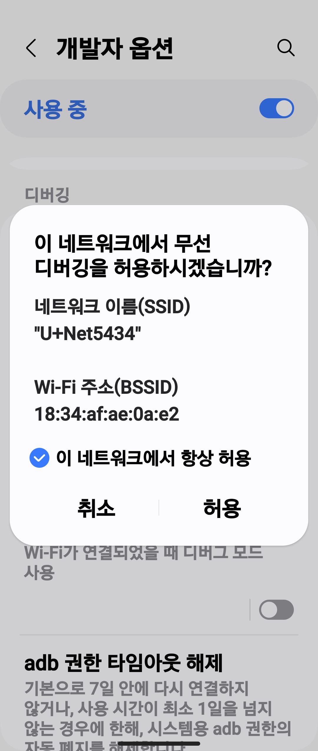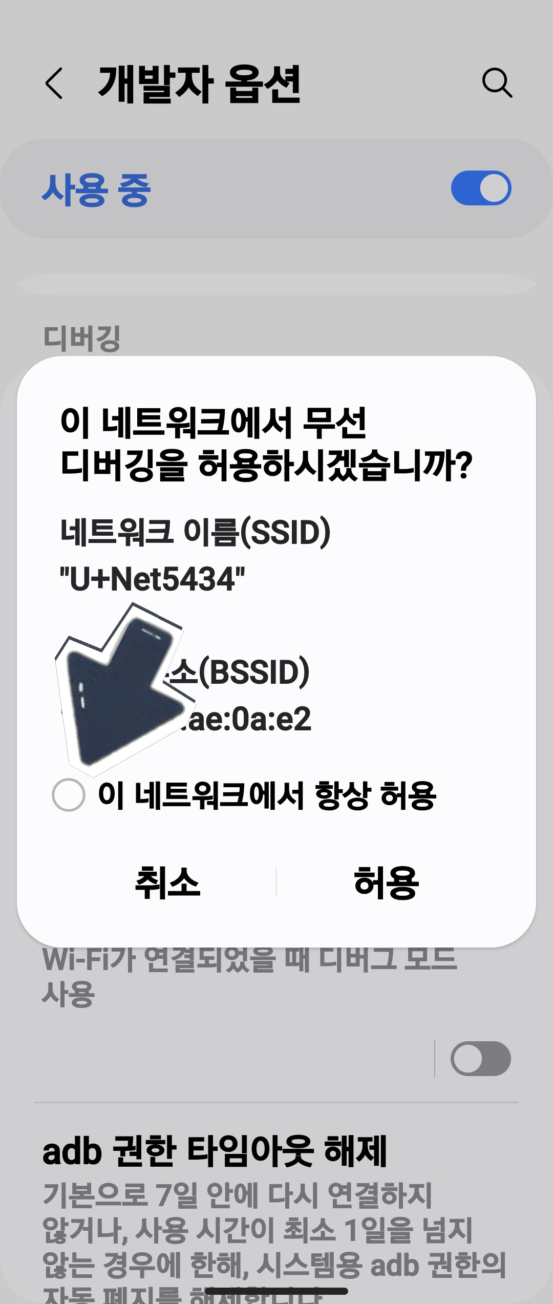 무선 디버깅 모드에서 이 네트워크 항상 허용을 체크합니다.