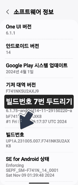 설정->휴대전화 정보에서 위로 스크롤->소프트웨어 정보->빌드번호 7번 터치