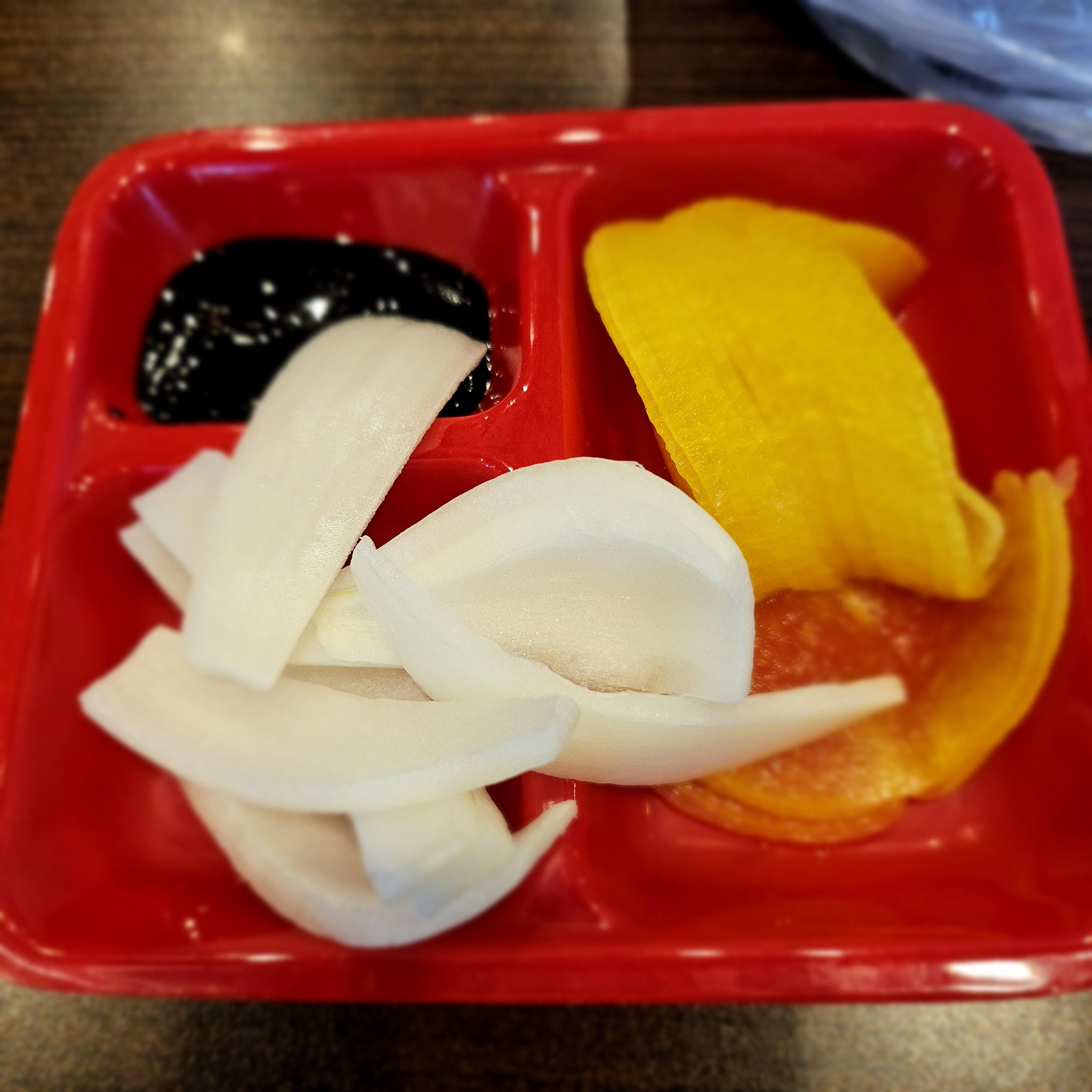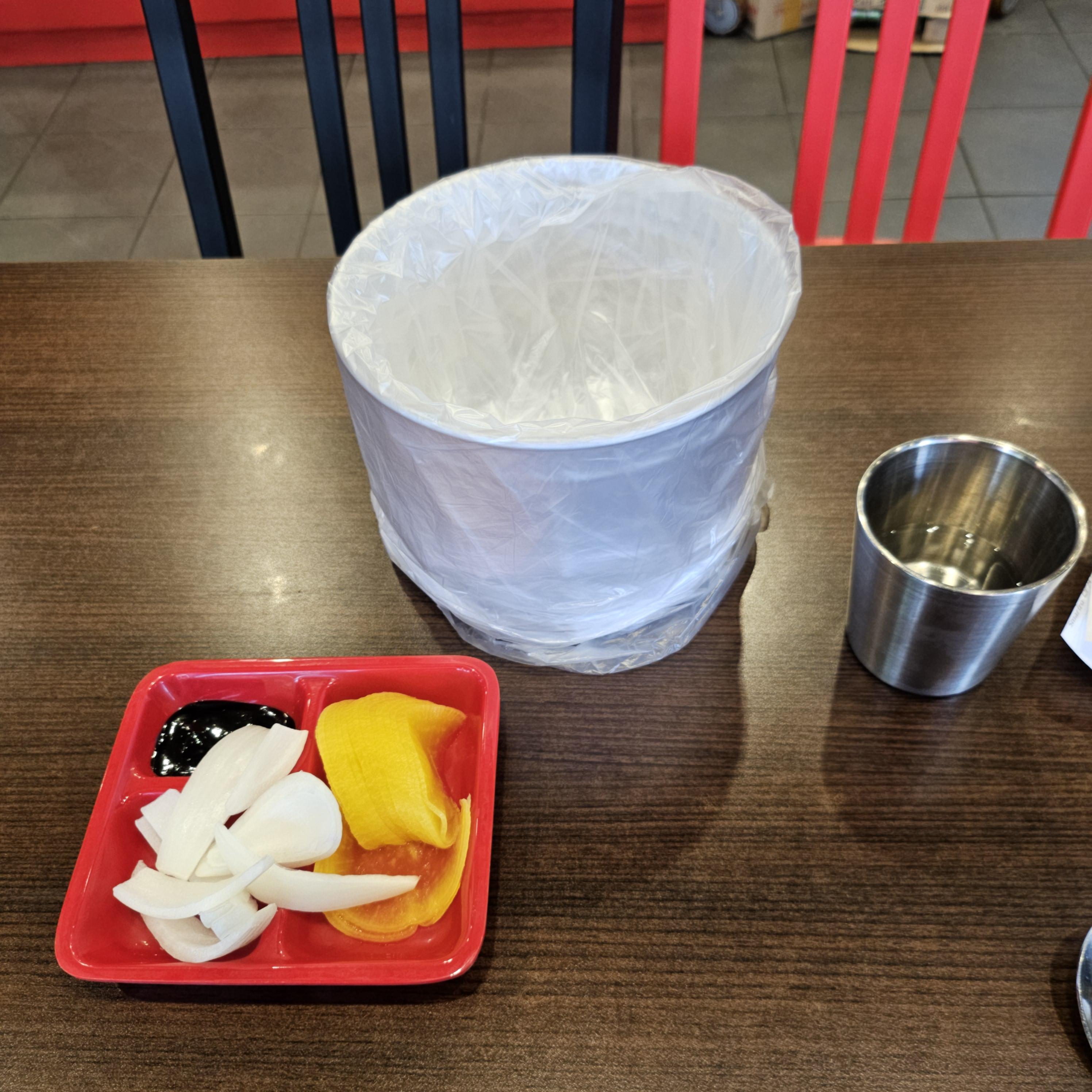 입구 오른쪽에는 셀프바가 있고 단무지, 양파 및 춘장이 있습니다.