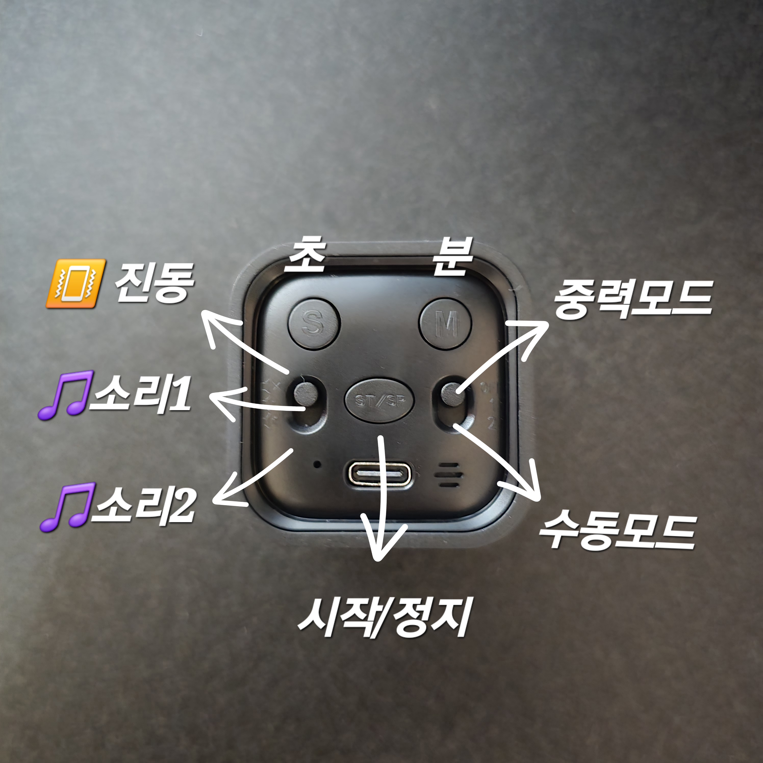 뒷면에서 왼쪽 스위치는 맨 위가 진동, 중간이 소리[크기 1], 밑에는 소리[크기 2] 입니다.