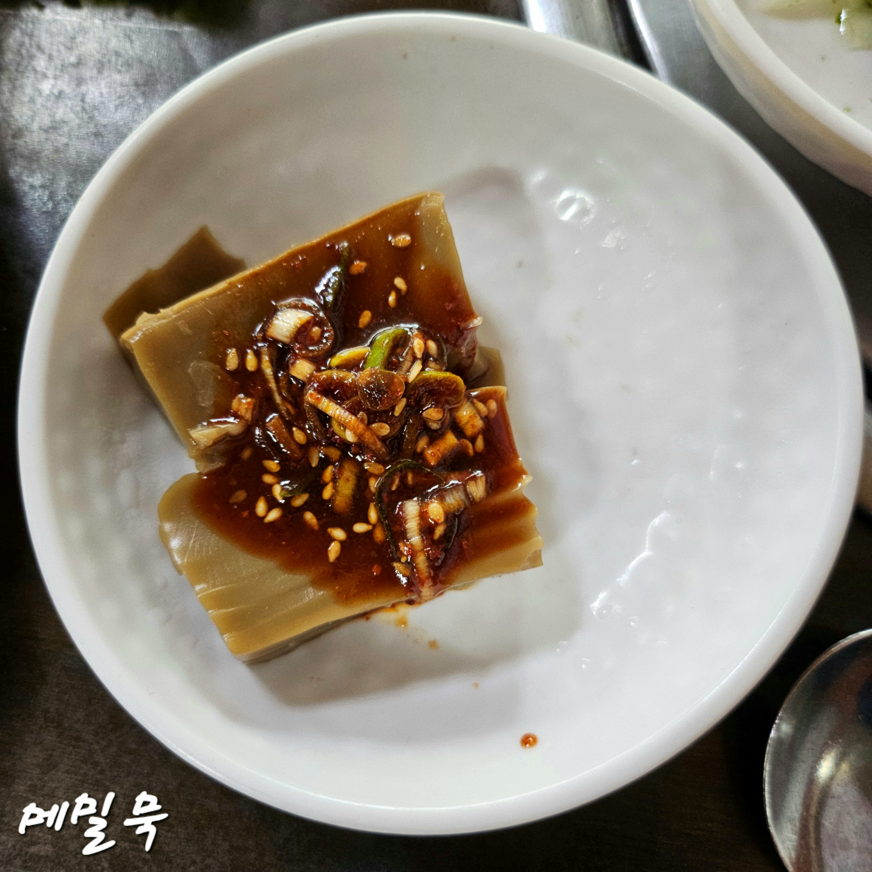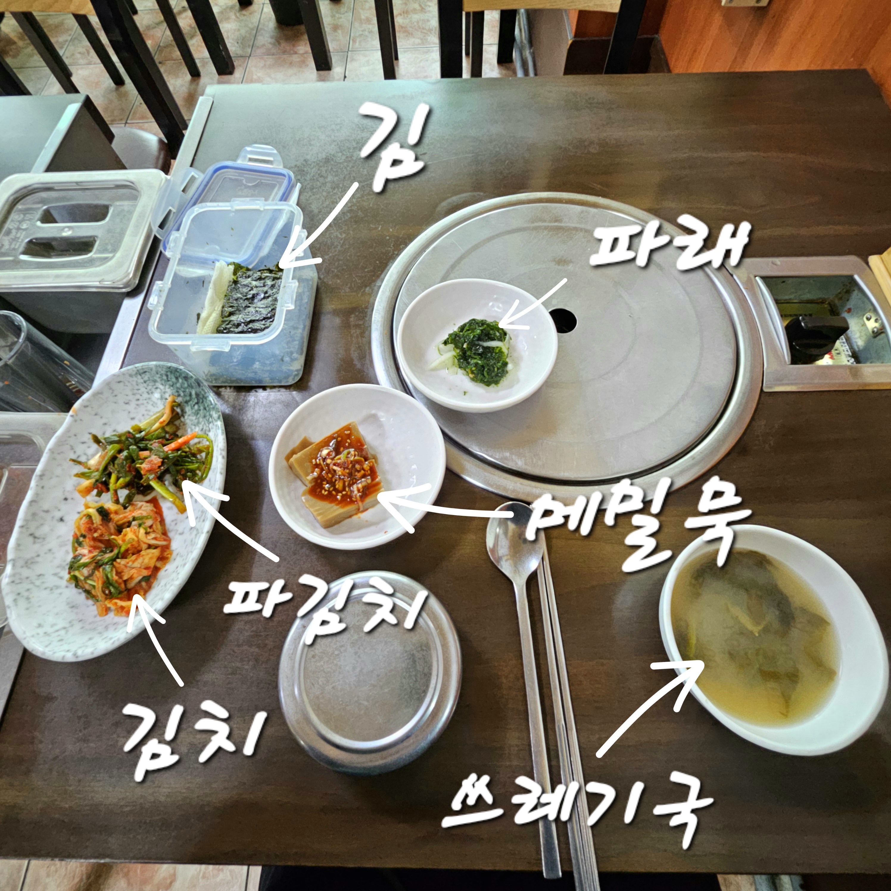 기본 반찬으로는 김치, 파김치, 파래, 메밀묵, 김이 나옵니다.
