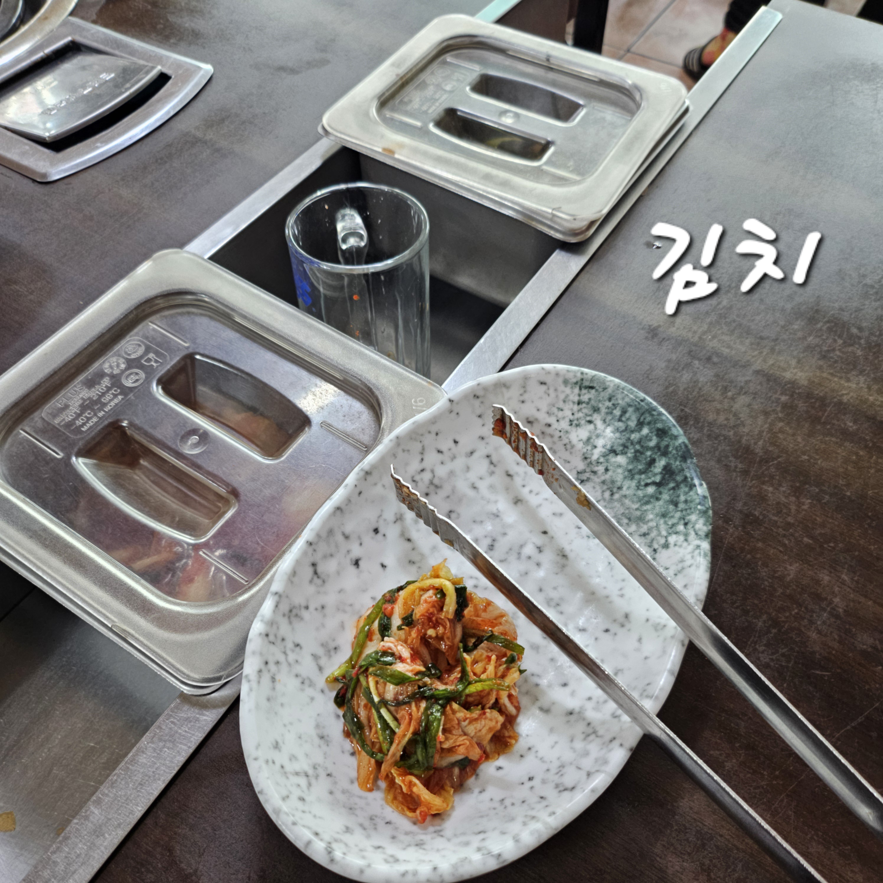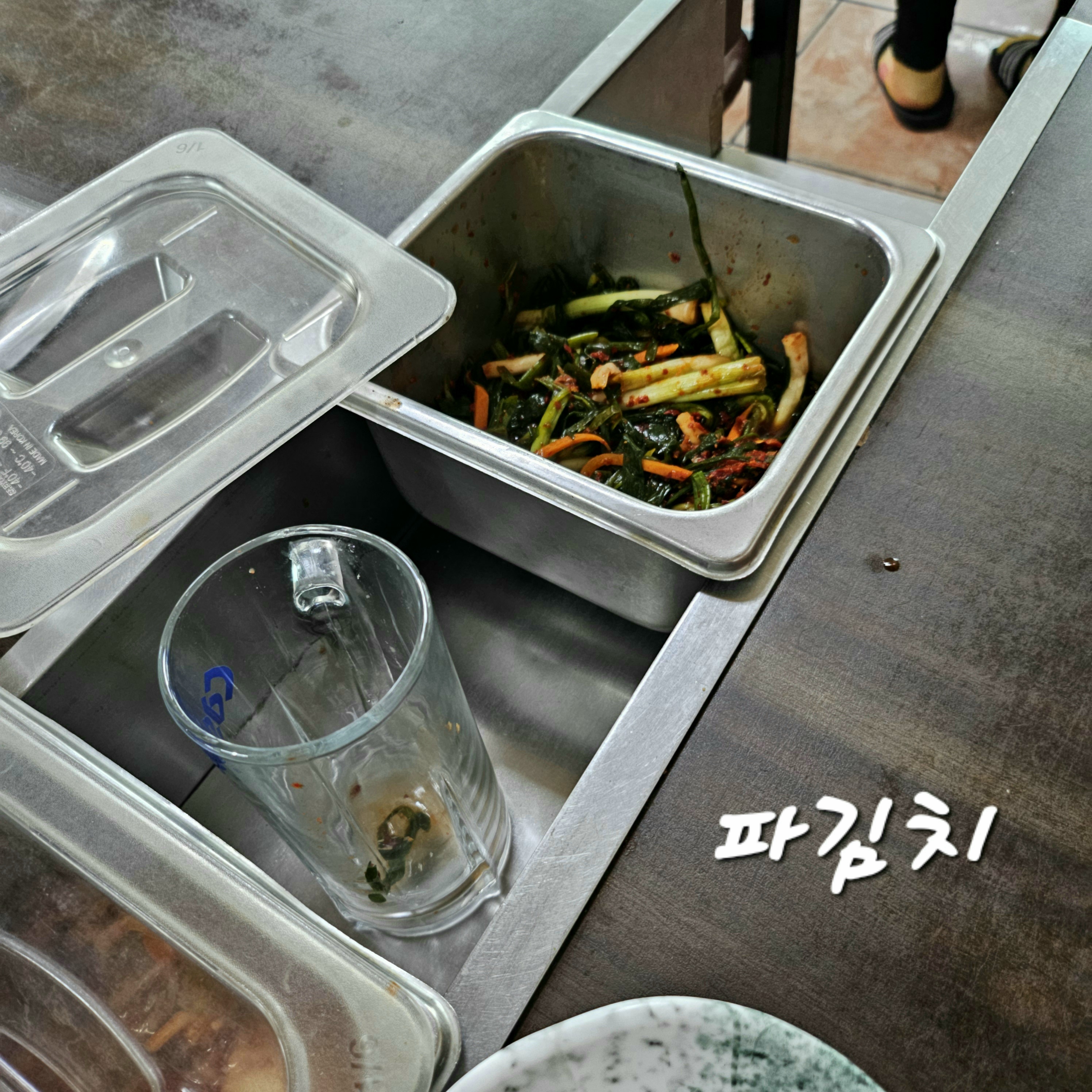 특이한 게 테이블옆에 통이 2개 있는데 각각의 통에는 김치와 파김치가 들어가 있어 덜어서 먹으면 됩니다.