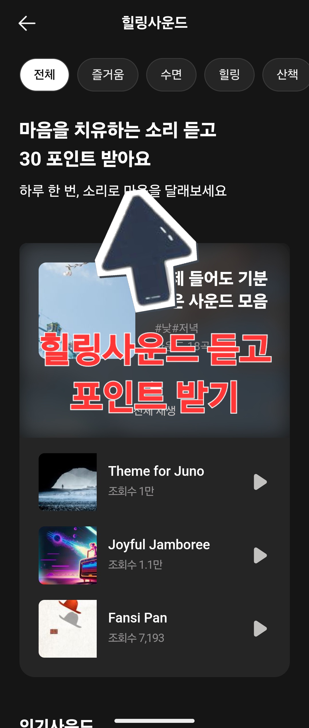 힐링사운드 콘텐츠가 생기고 힐링 사운드를 들으면 30포인트 적립됩니다.🎵💫
