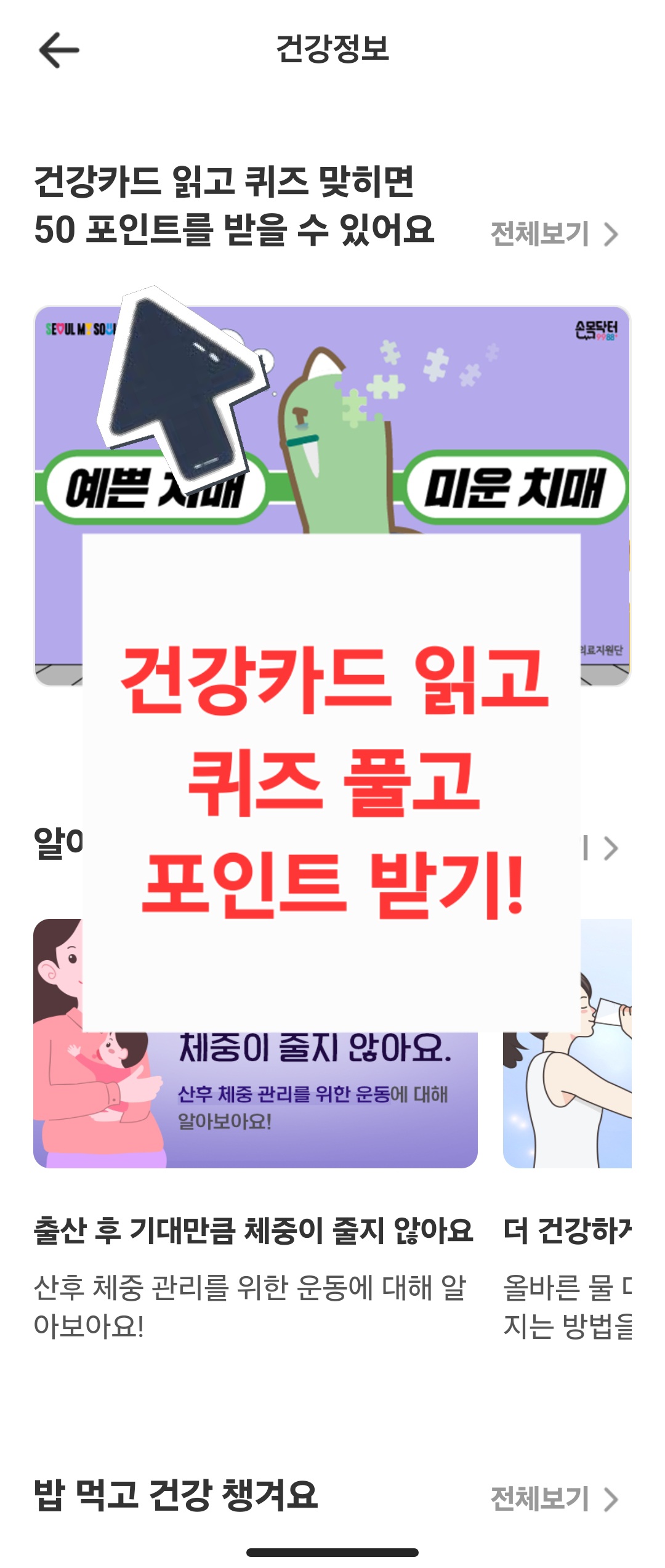 건강카드는 보통 4장 구성되며, 카드를 모두 읽고 나면 퀴즈가 출제됩니다. 퀴즈를 맞히면 50포인트 적립이 이루어집니다. 기존에는 100포인트에서 50포인트로 조정되었습니다.