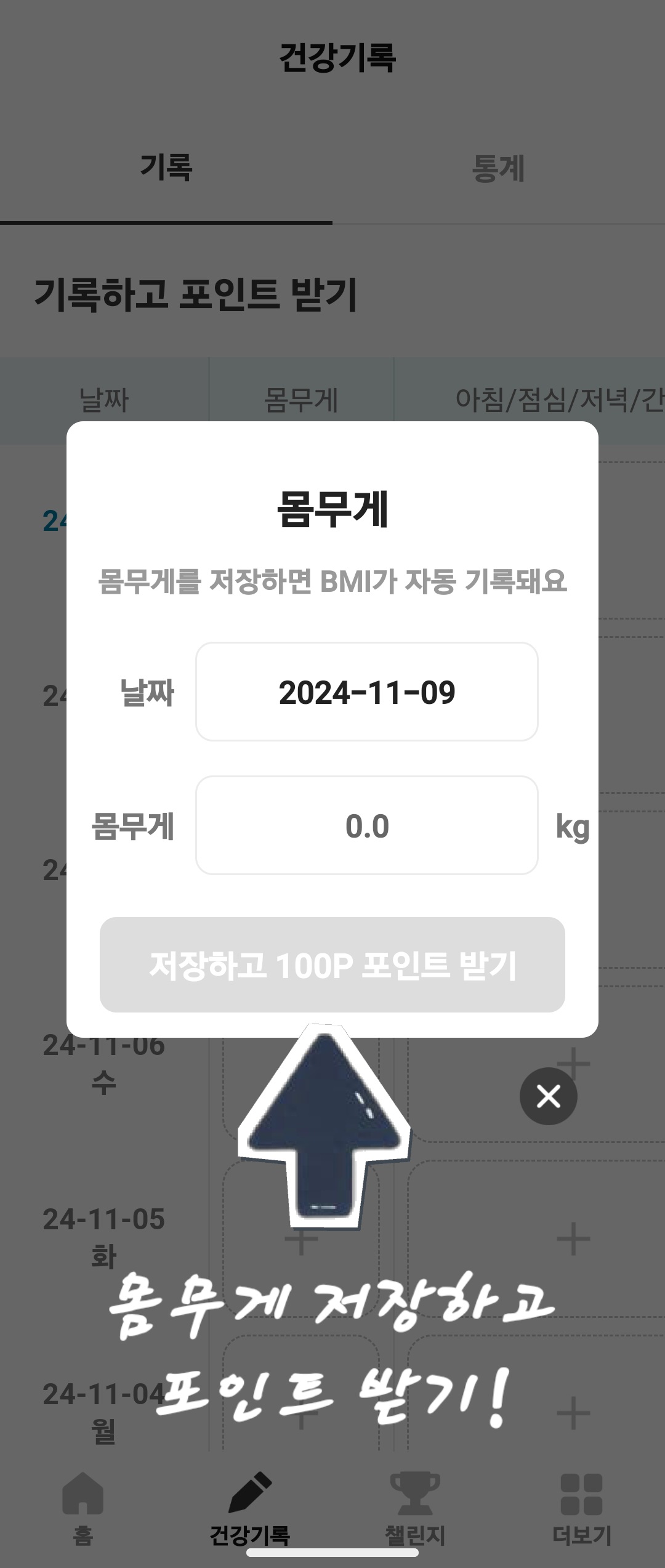 매일 체중을 입력하시면 100포인트 적립이 이루어집니다. 간단하고, 포인트는 높습니다.