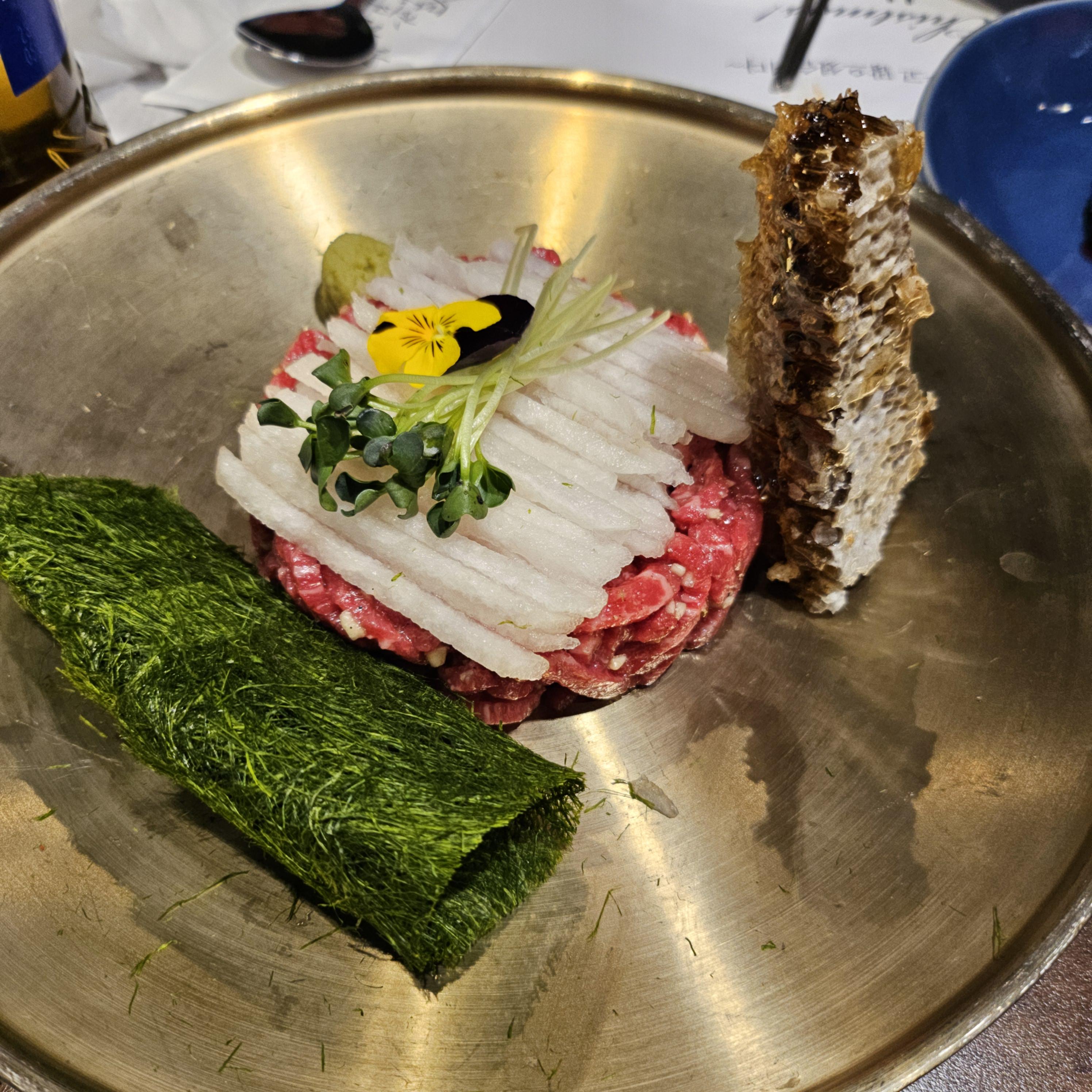 감태에 "육회 + 고추냉이 + 배 + 벌집 + 새싹"을 함께 싸 먹으면 최고입니다.