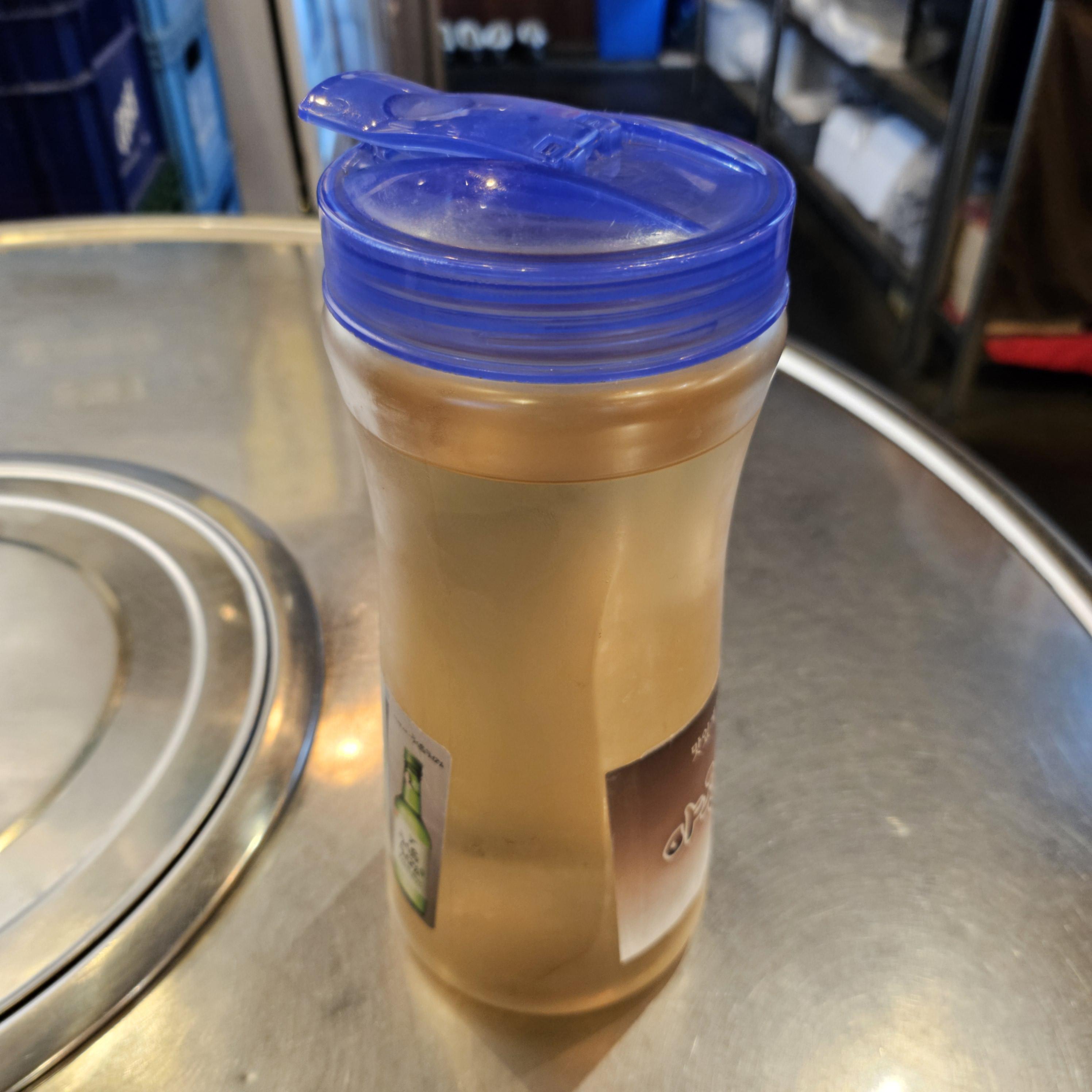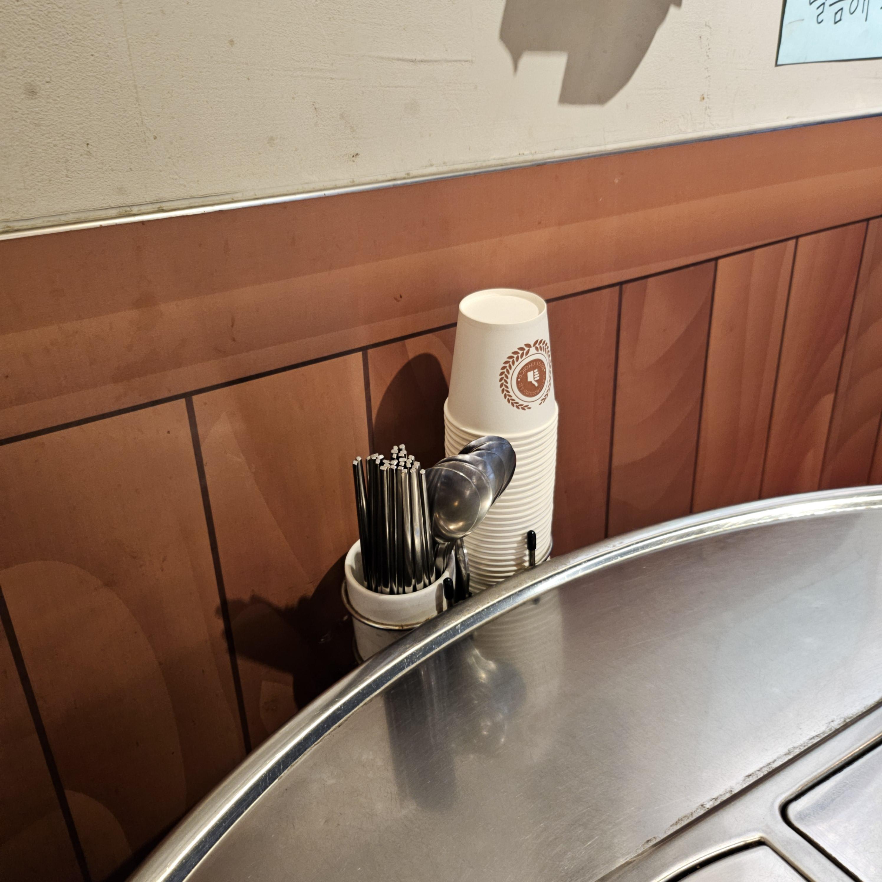 테이블 옆에 수저통과 1회용 종이컵이 있습니다.