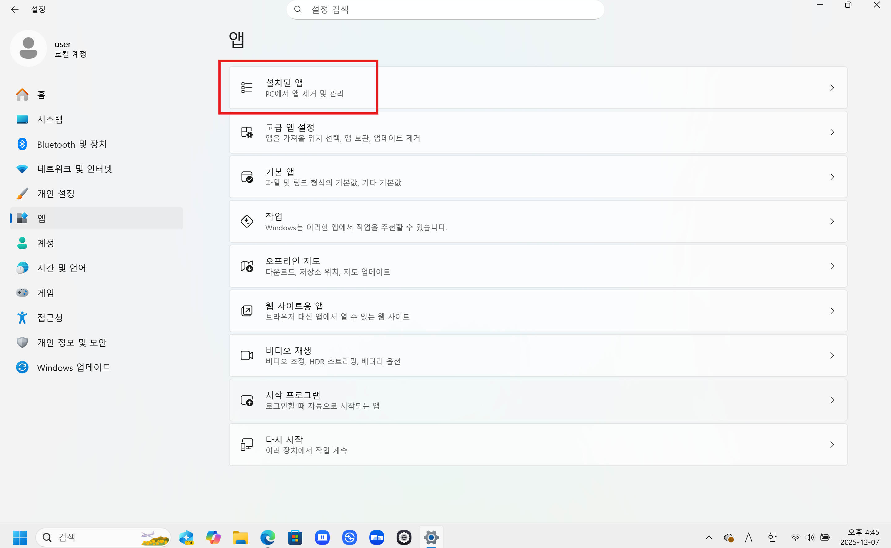 - 왼쪽 메뉴에서 [앱]을 선택한 후 [설치된 앱]을 클릭합니다.