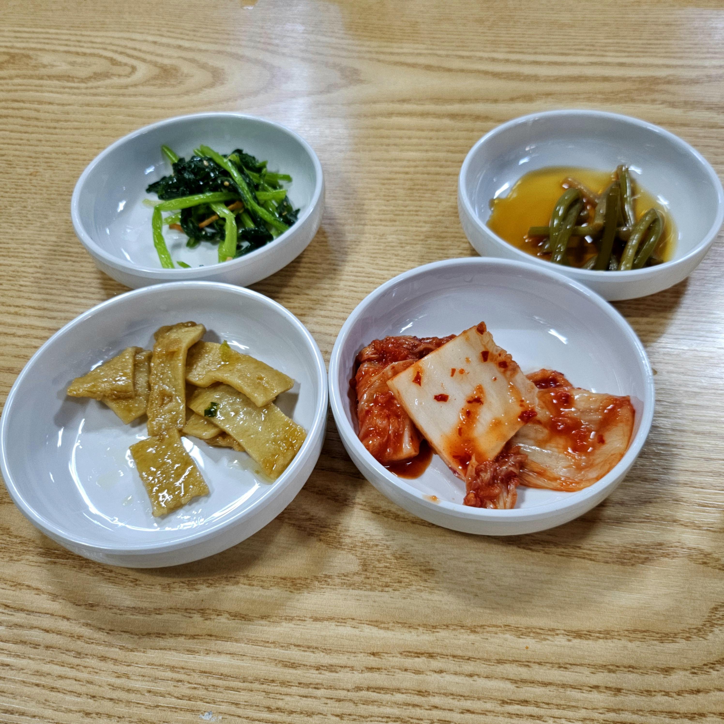 기본 반찬은 어묵무침, 김치, 나물 그리고 오른쪽 상단은 나물 장아찌??