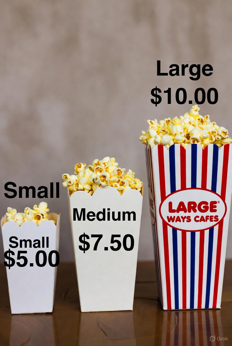 - 소비자 심리: "Medium 살 바엔 500원 더 내고 Large 먹는 게 이득이네?"라고 생각하며 결과적으로 가장 비싼 Large를 선택하게 됩니다.