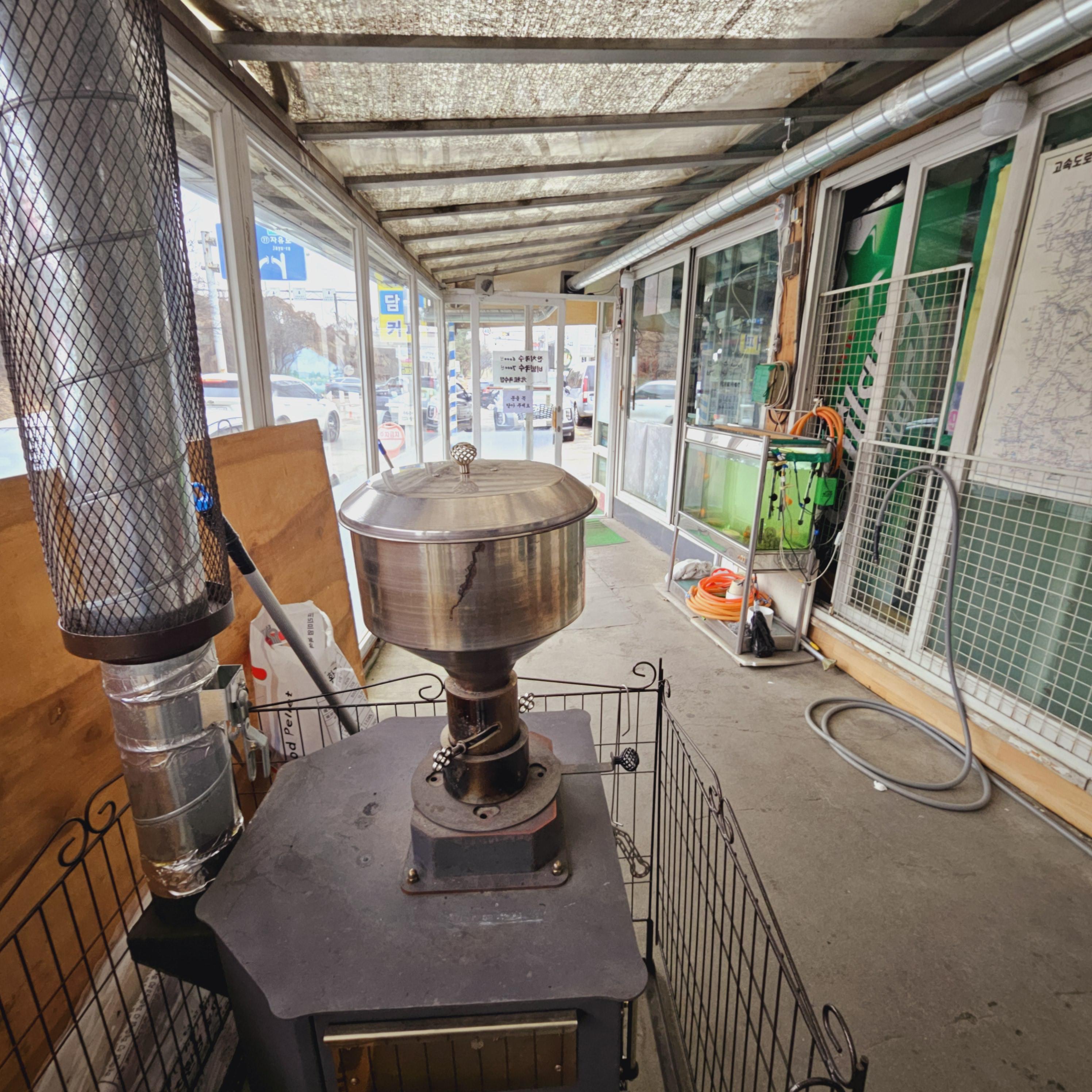 통로에 화장실이 있고 엔틱 한 난로도 있습니다.