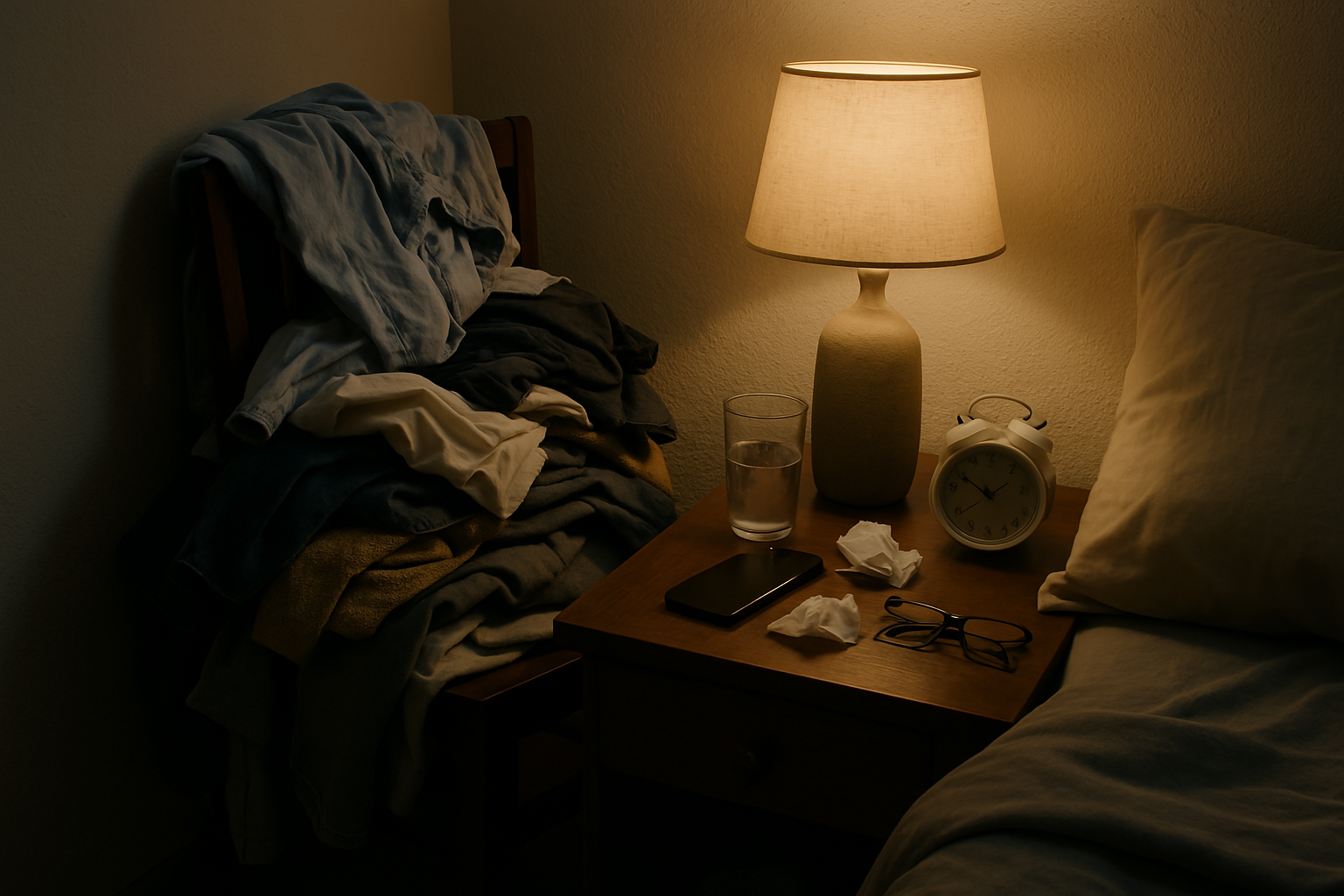 침실 한구석, 의자 위에 산더미처럼 쌓인 옷들.