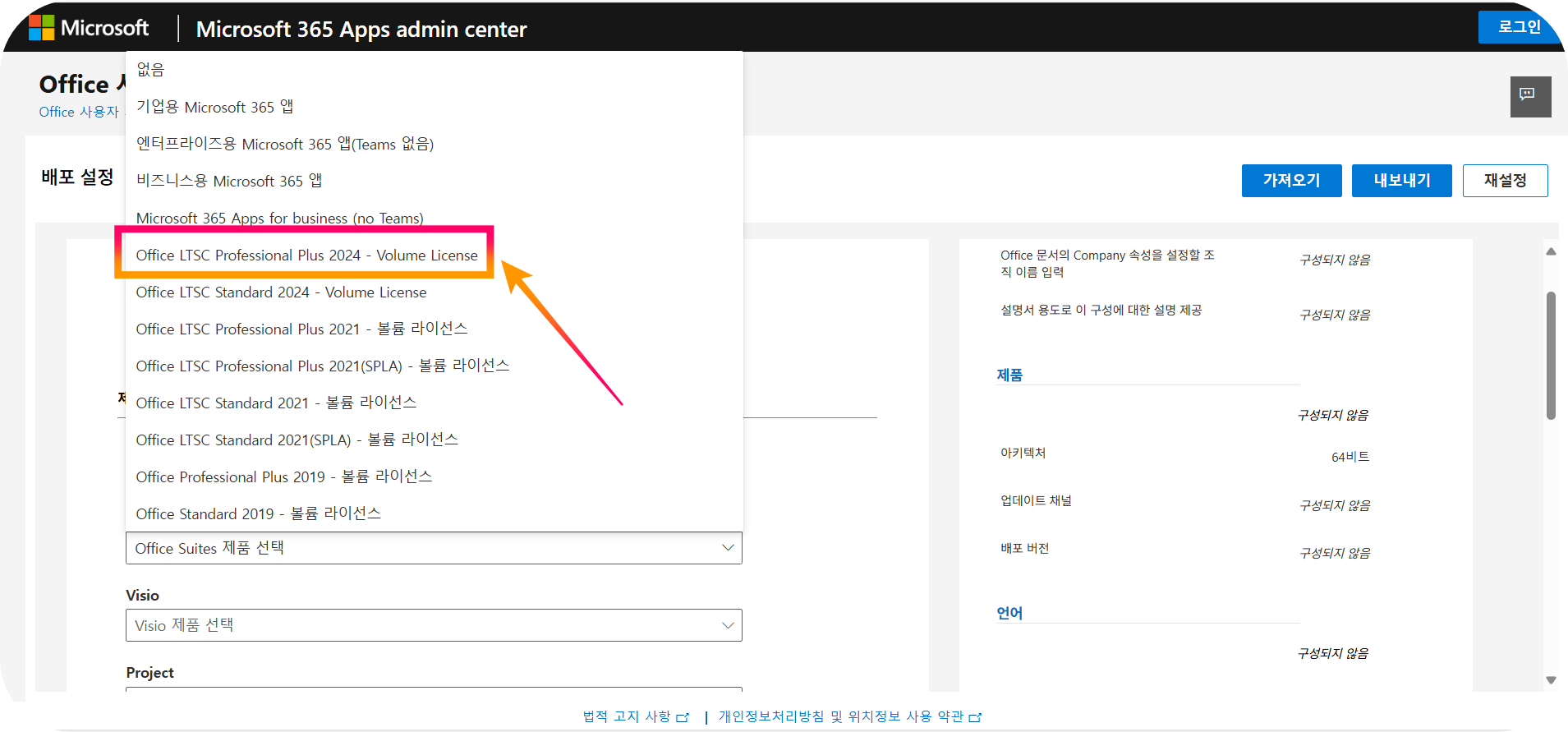 - Office 제품군에서는 Office LTSC Professional Plus 2024를 선택합니다. 이것이 바로 영구 라이선스 버전입니다.