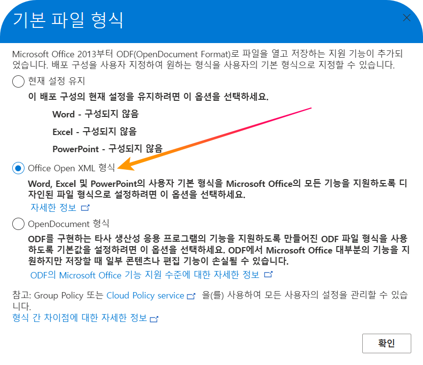 - Office Open XML 형식을 선택하여 Configuration.xml 파일을 다운로드합니다. 이 파일이 바로 여러분만의 맞춤 설치 설계도입니다.
