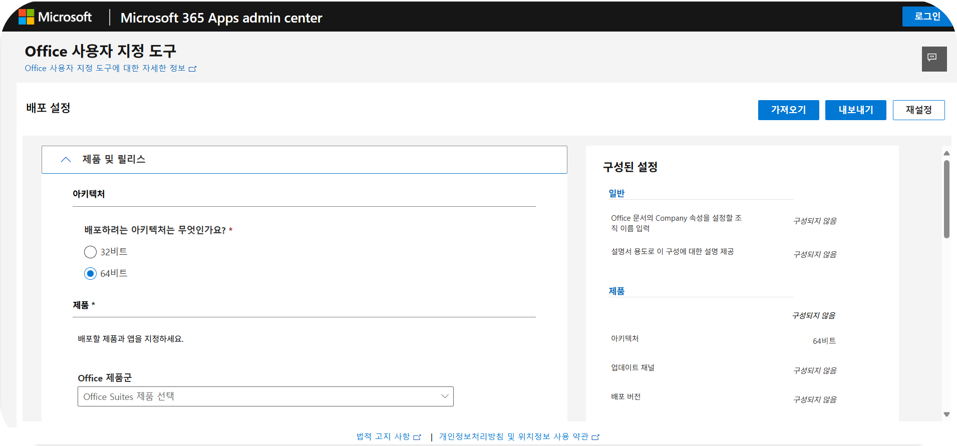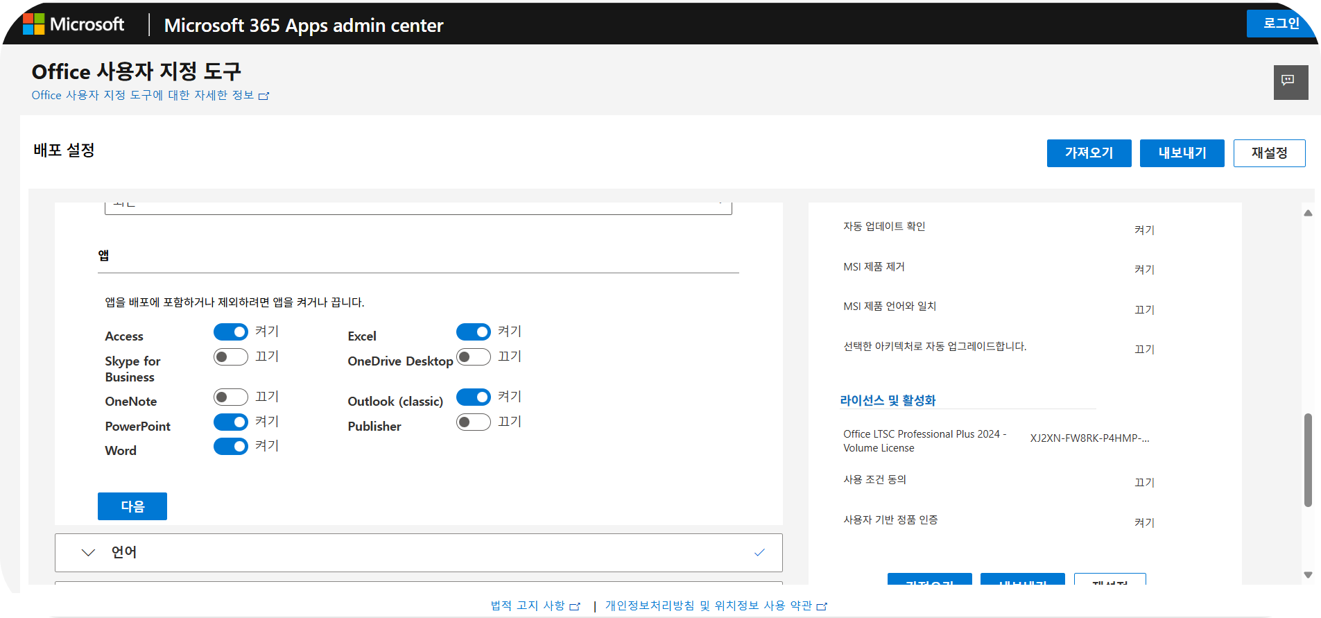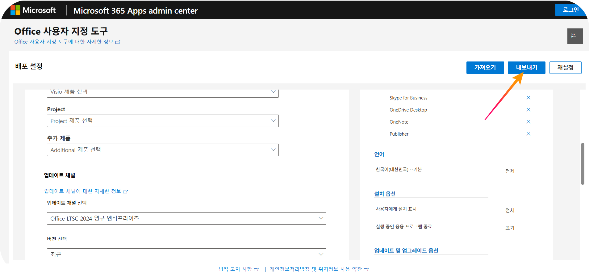- 설치가 필요한 앱(Word, Excel, PowerPoint 등)과 주 사용 언어(한국어)를 선택한 후, 우측 상단의 내보내기 버튼을 클릭하세요.