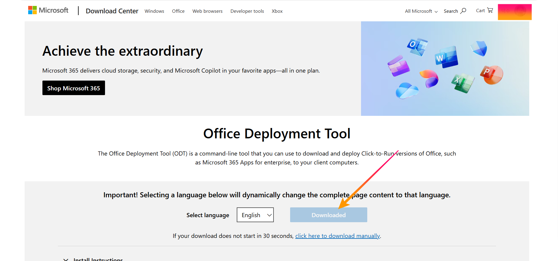 - Microsoft 다운로드 센터에 방문하여 Office 배포 도구를 다운로드합니다.