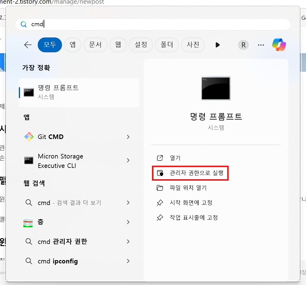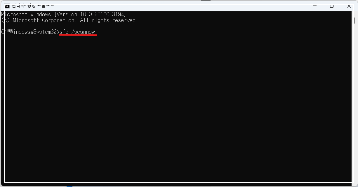 - 관리자 권한으로 명령 프롬프트를 실행 후 `sfc /scannow` 명령을 입력하여 시스템 파일 무결성을 검사합니다.