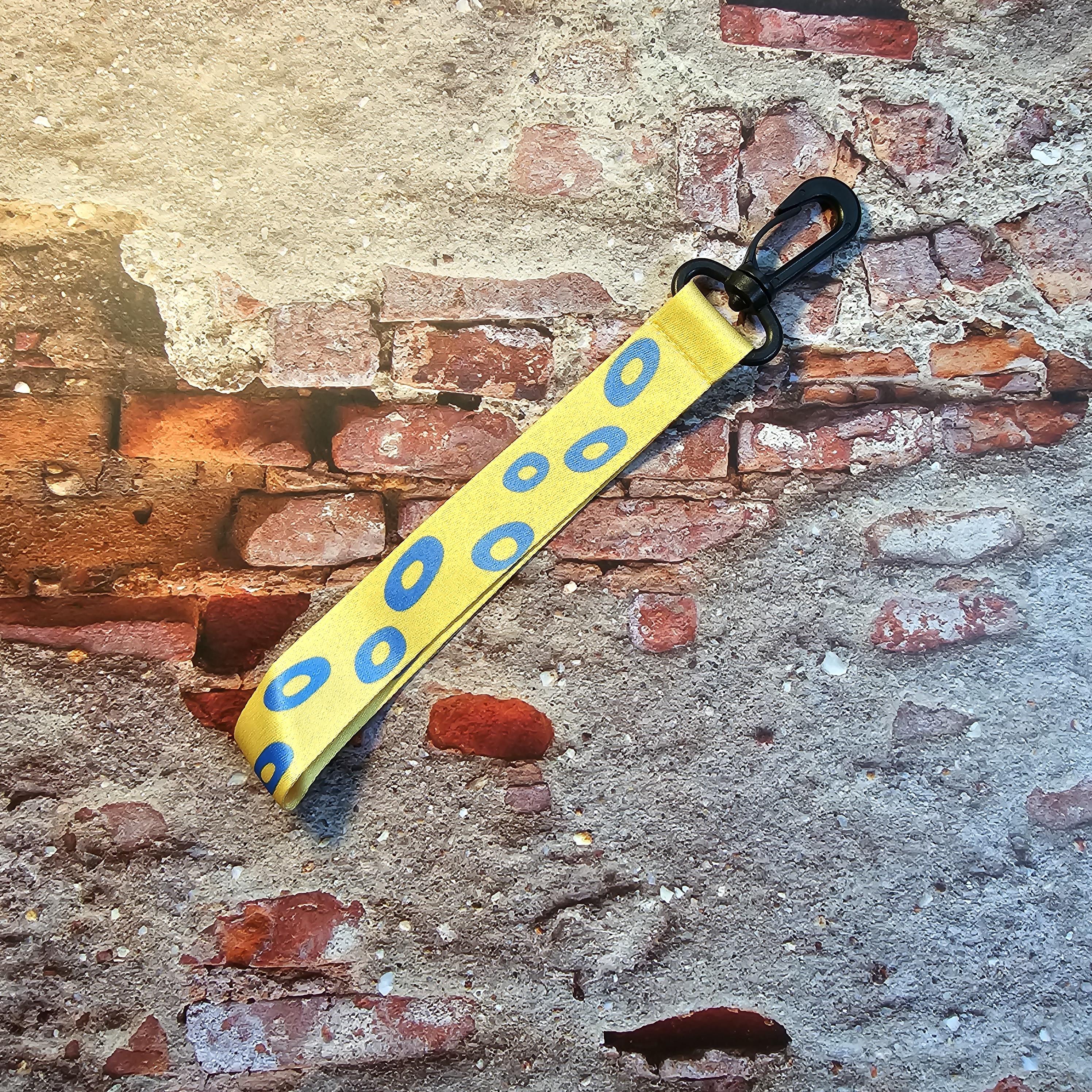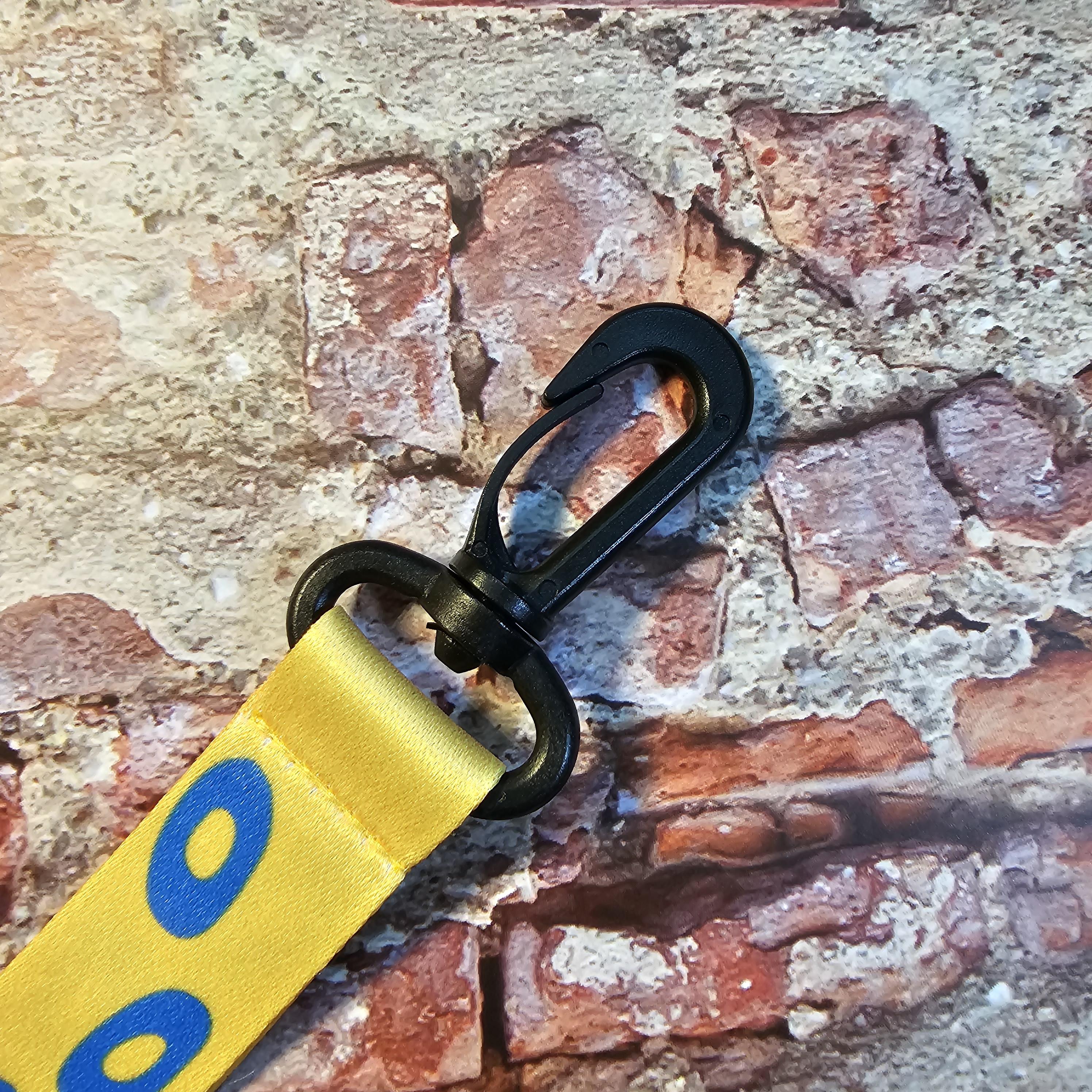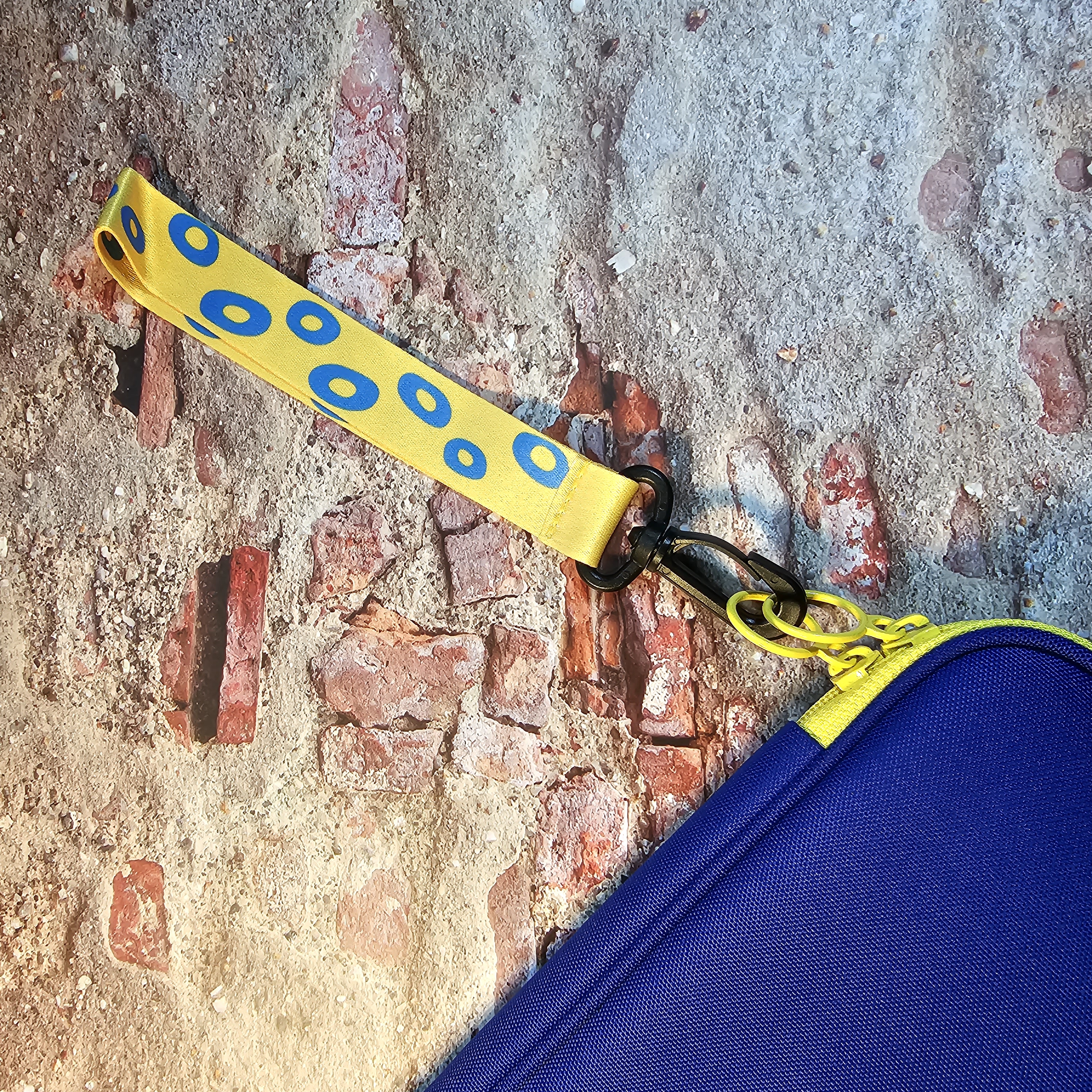 키링은 노란색 바탕에 파란색 얼룩무늬로