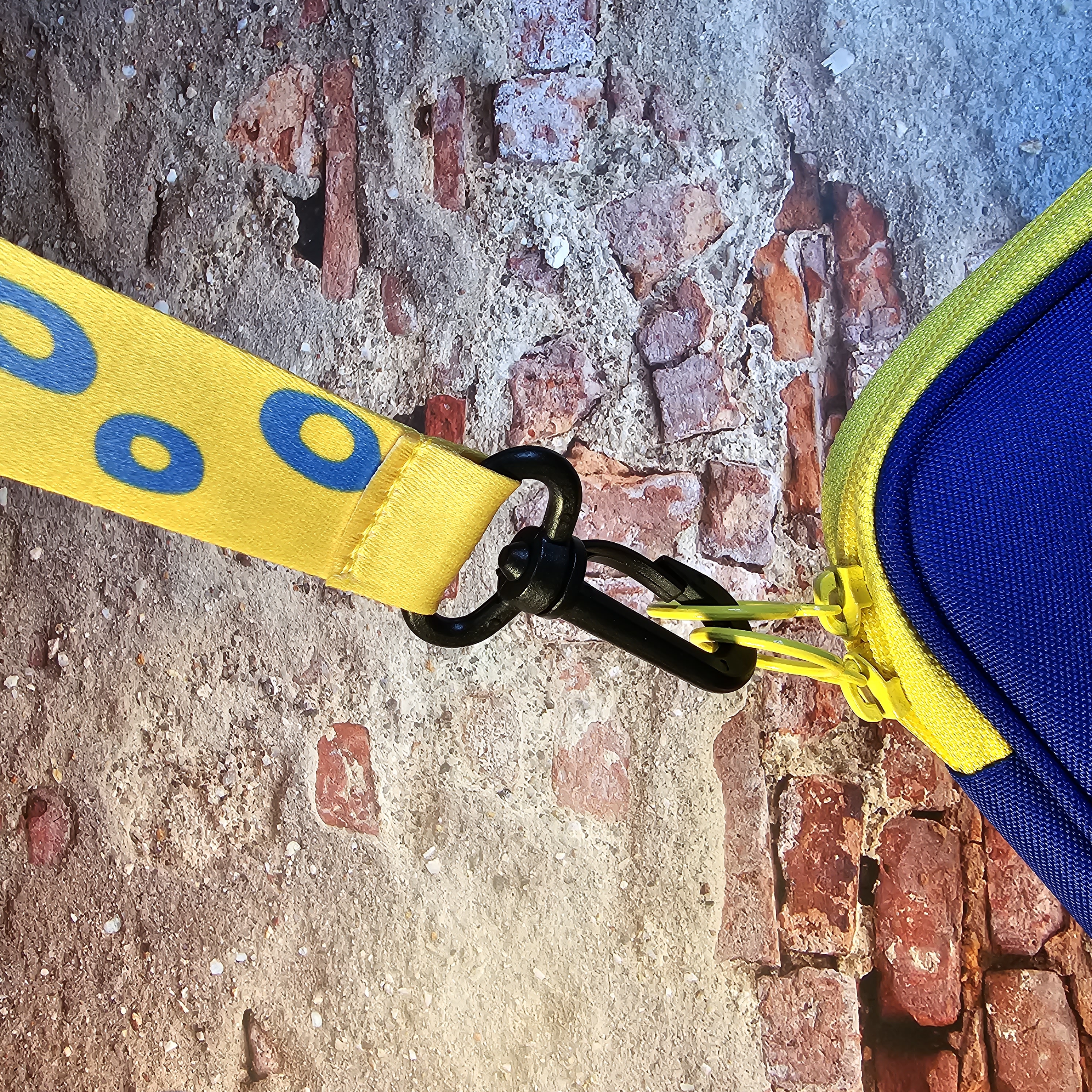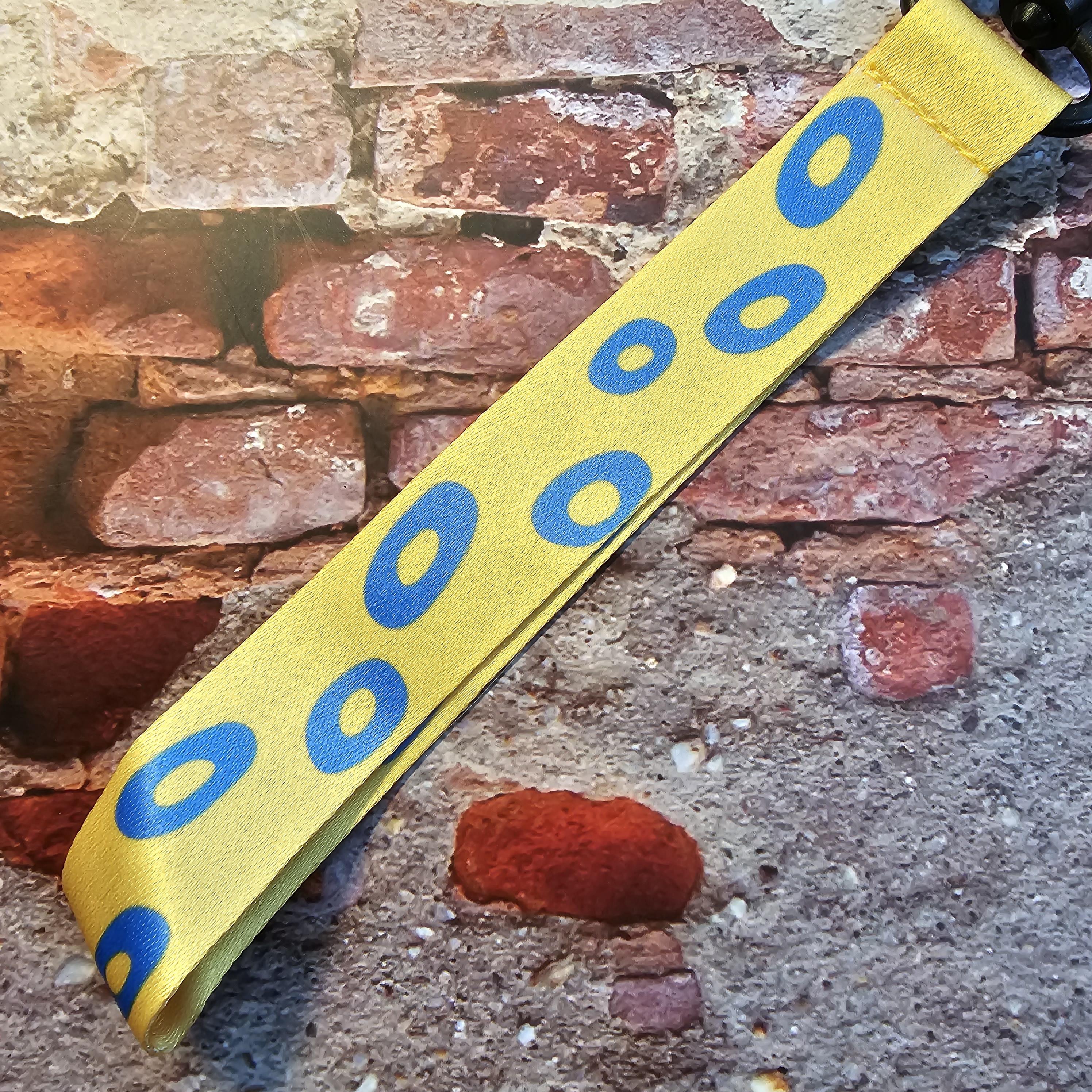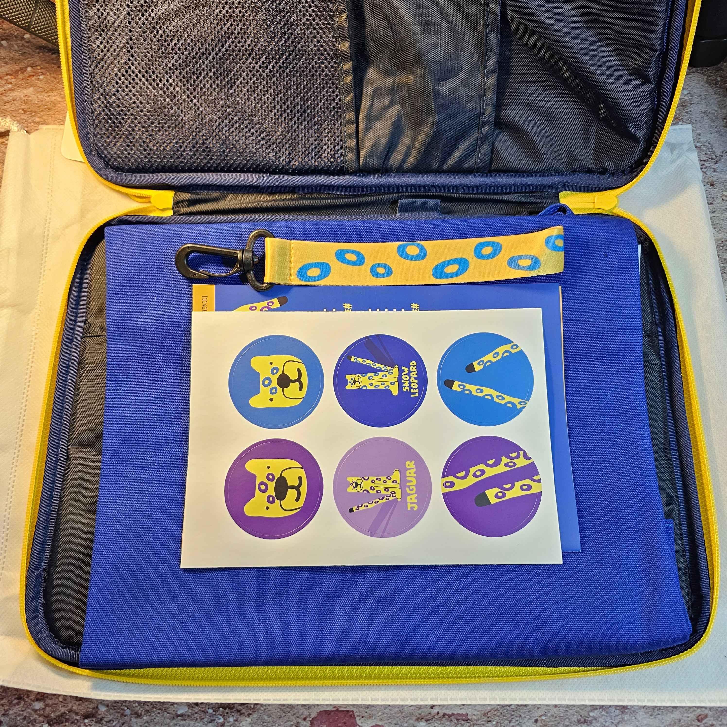 키링은 노란색 바탕에 파란색 얼룩무늬로