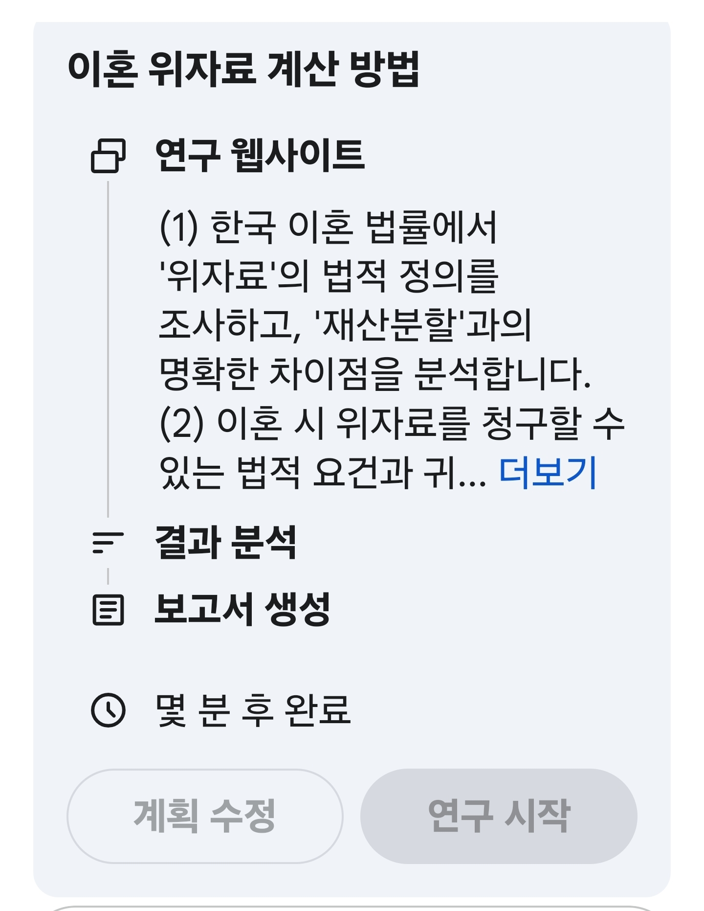 라는 답변과 아래 사진과 같은 연구 계획표가 나왔고 연구 시작을 눌렀습니다.