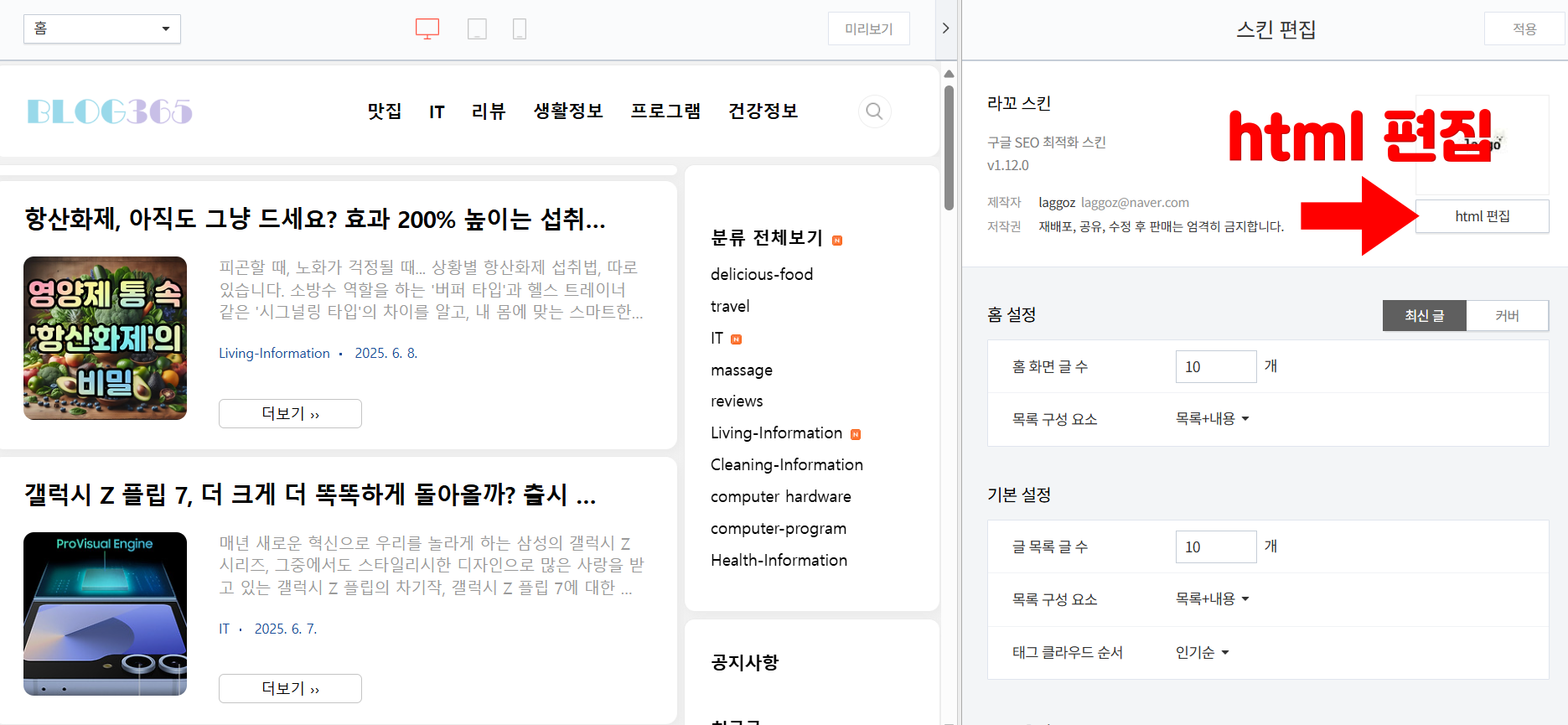 - 오른쪽 상단의 html 편집 버튼을 클릭합니다.