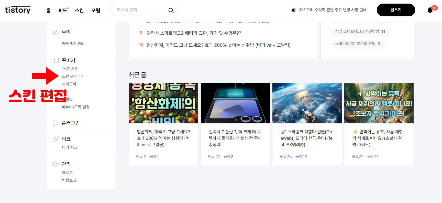 코드를 복사했다면, 이제 내 블로그에 심어줄 차례입니다.