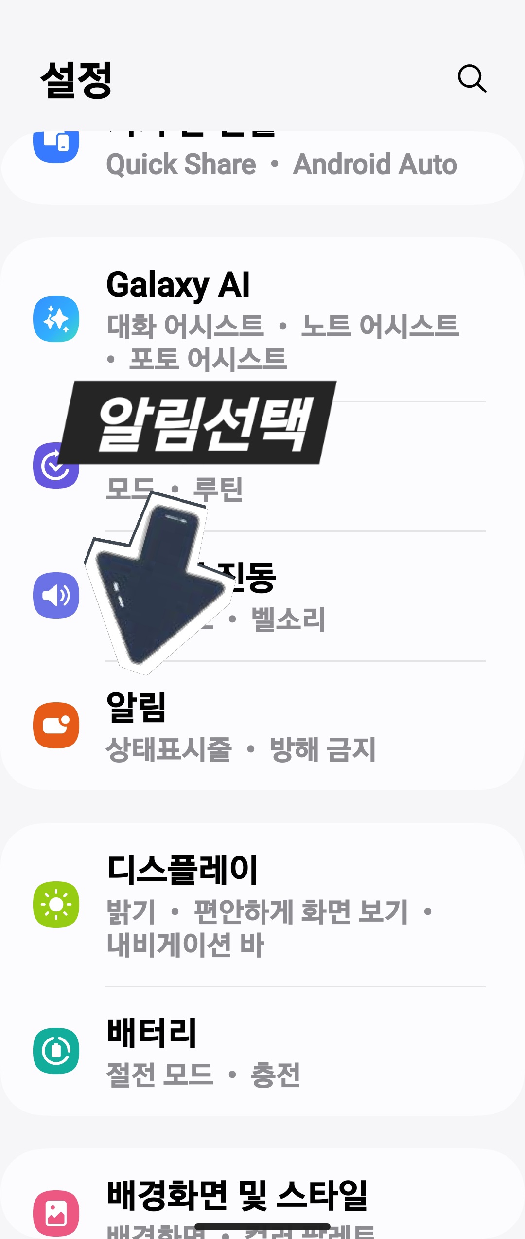 - 설정 화면에서 '알림' 항목을 찾아 터치합니다.