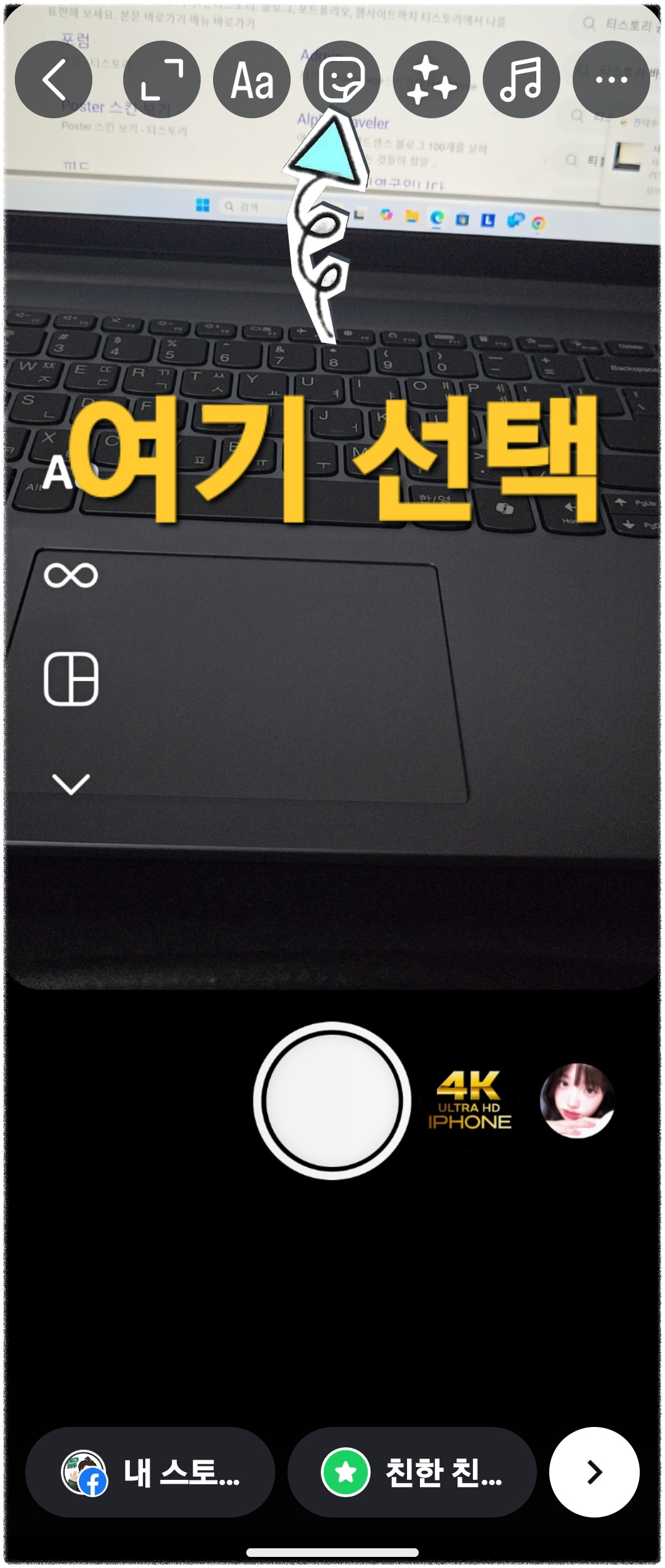 4. 갤러리에서 사진을 선택 후 위쪽에 "네모난 이모티콘"을 선택합니다.