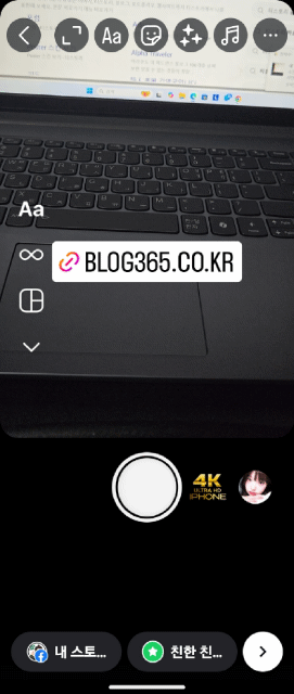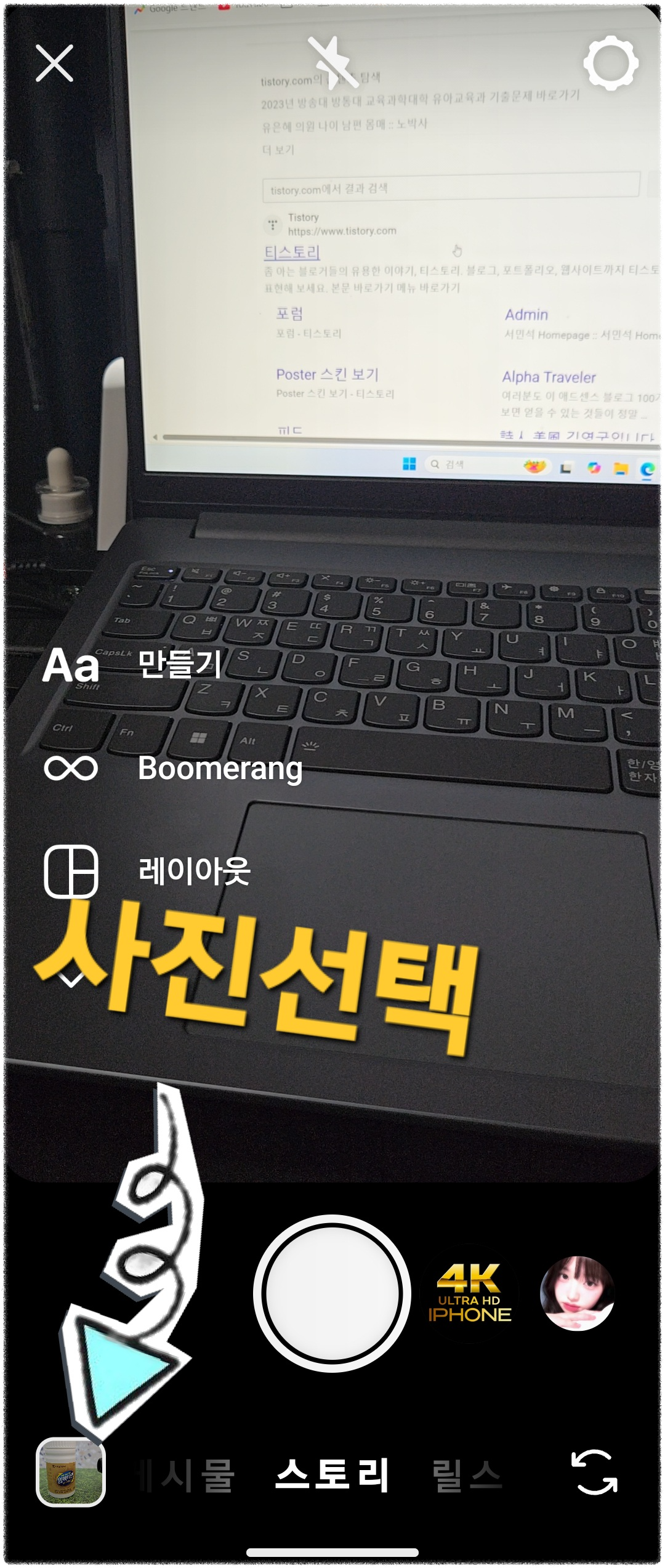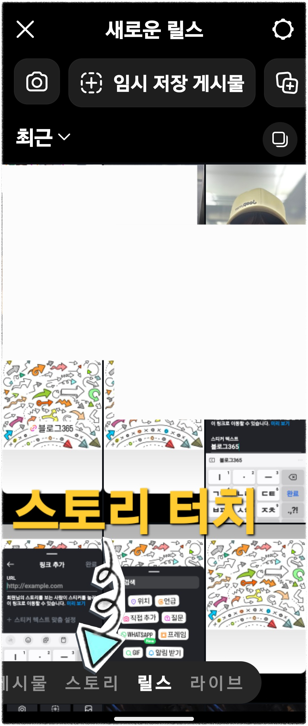 2. 밑에 게시물, 스토리, 릴스, 라이브 중에 스토리를 클릭합니다.