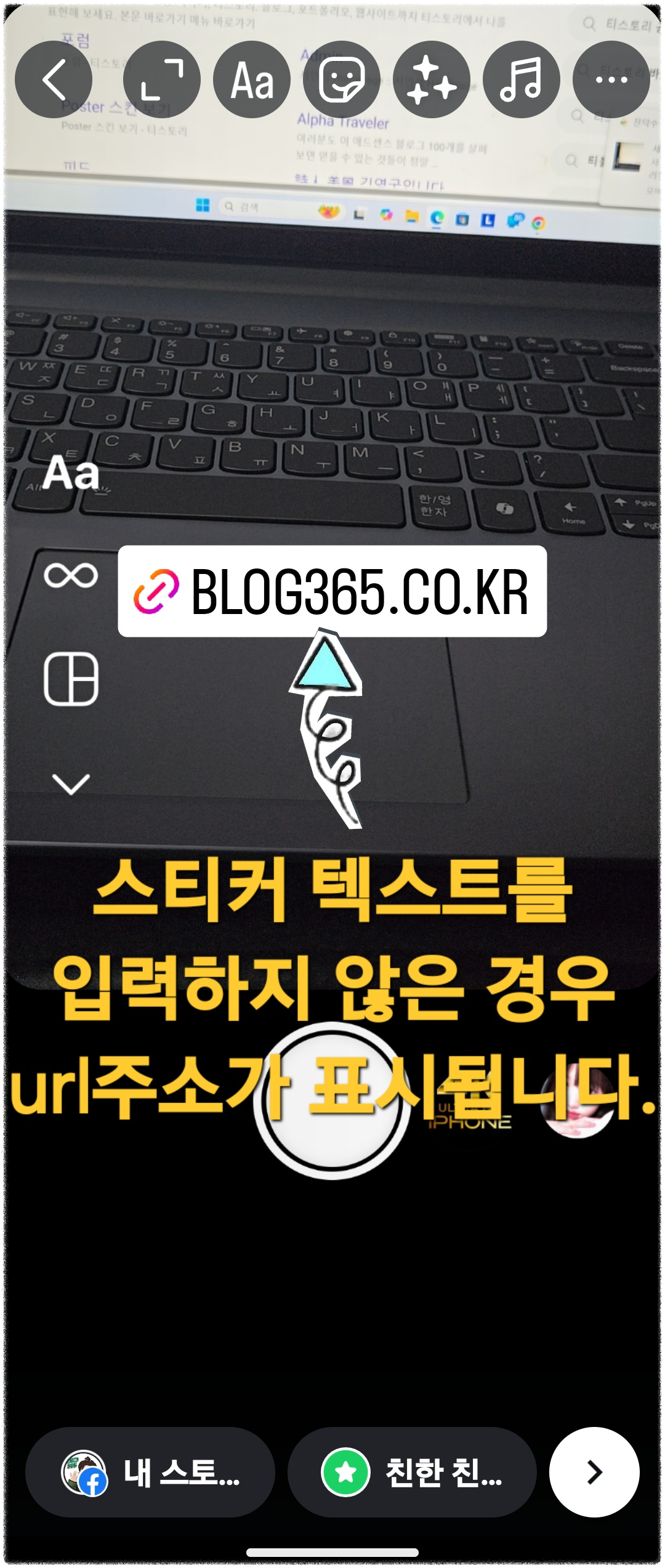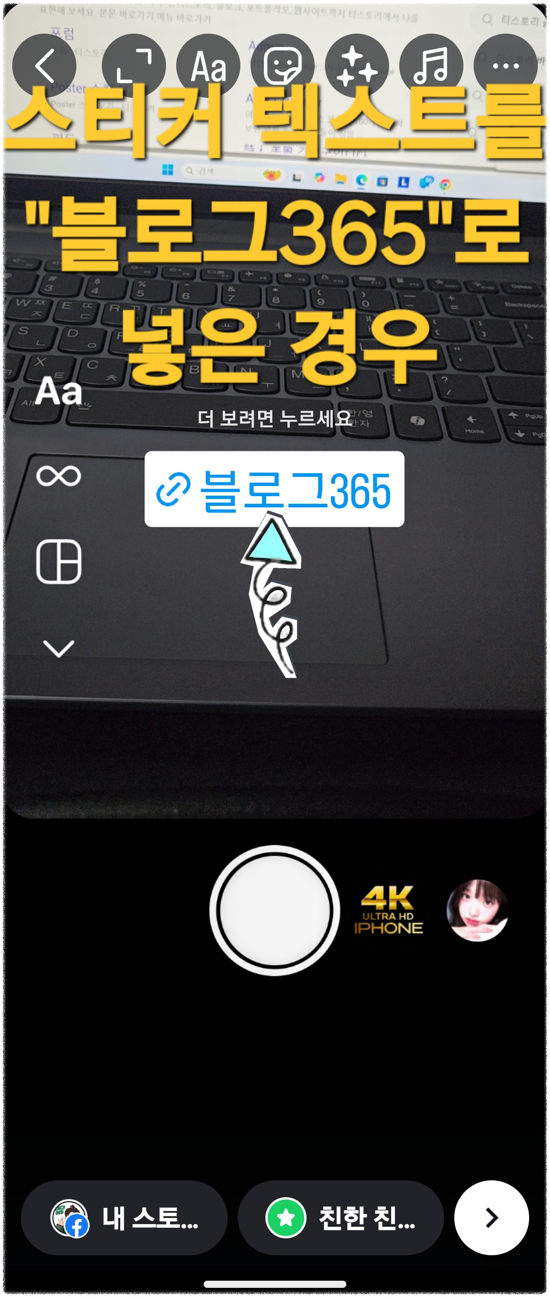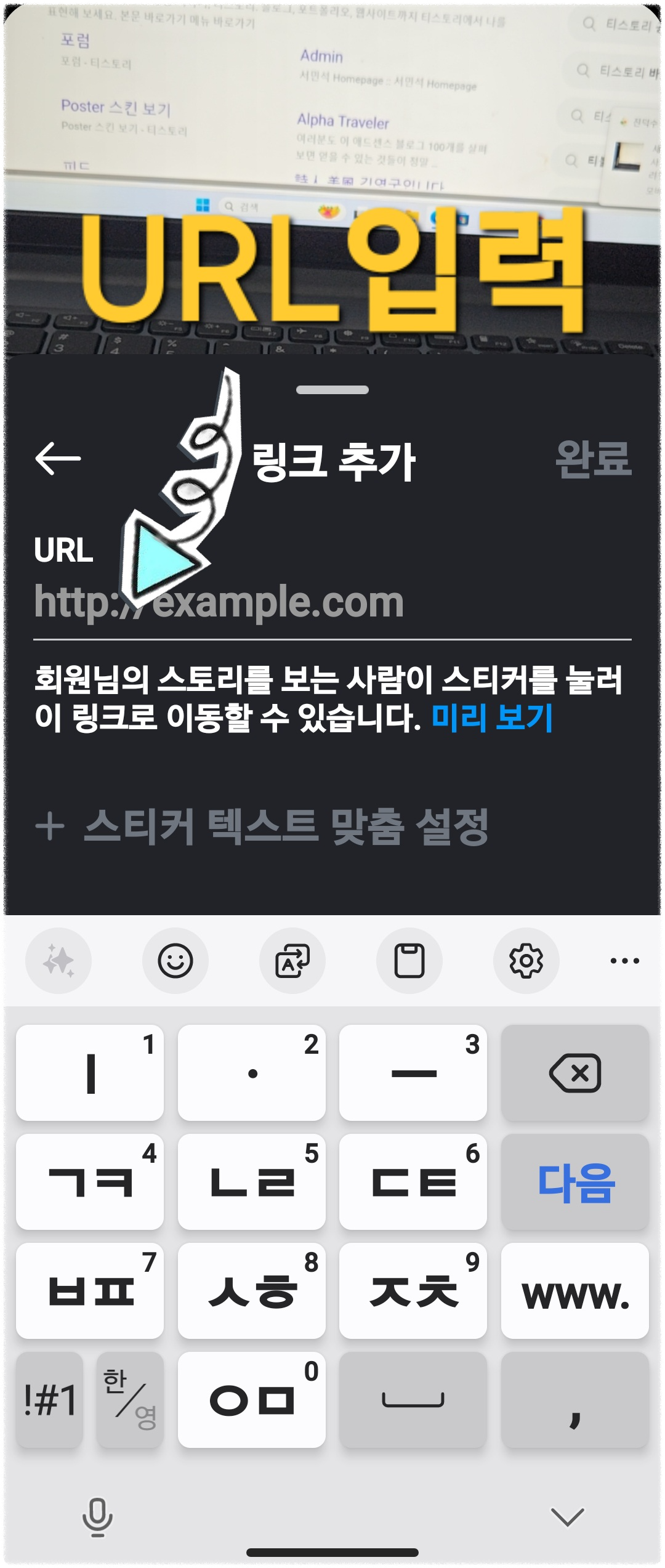 화면을 위로 스와이프 하면 밑에 링크 스티커가 있습니다.