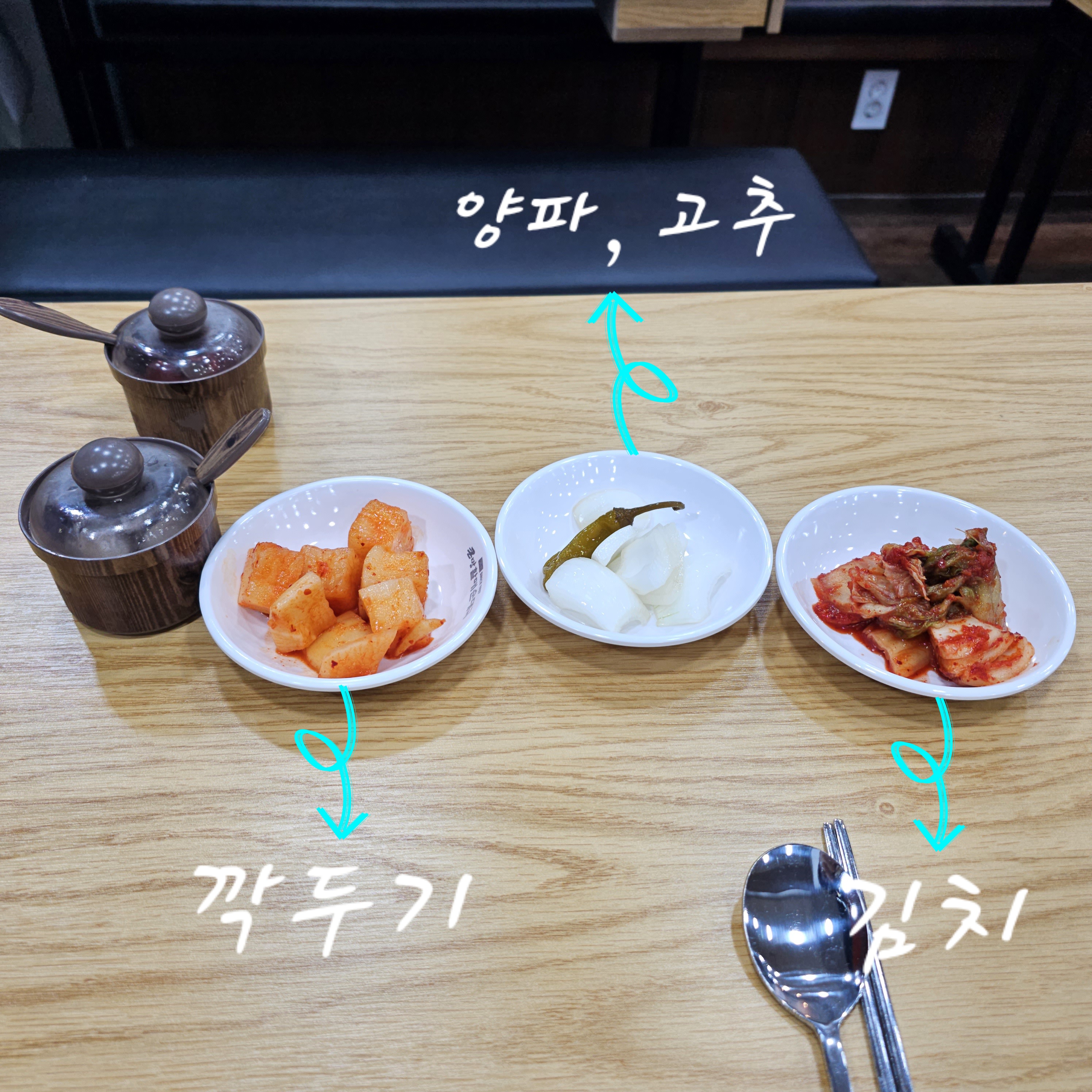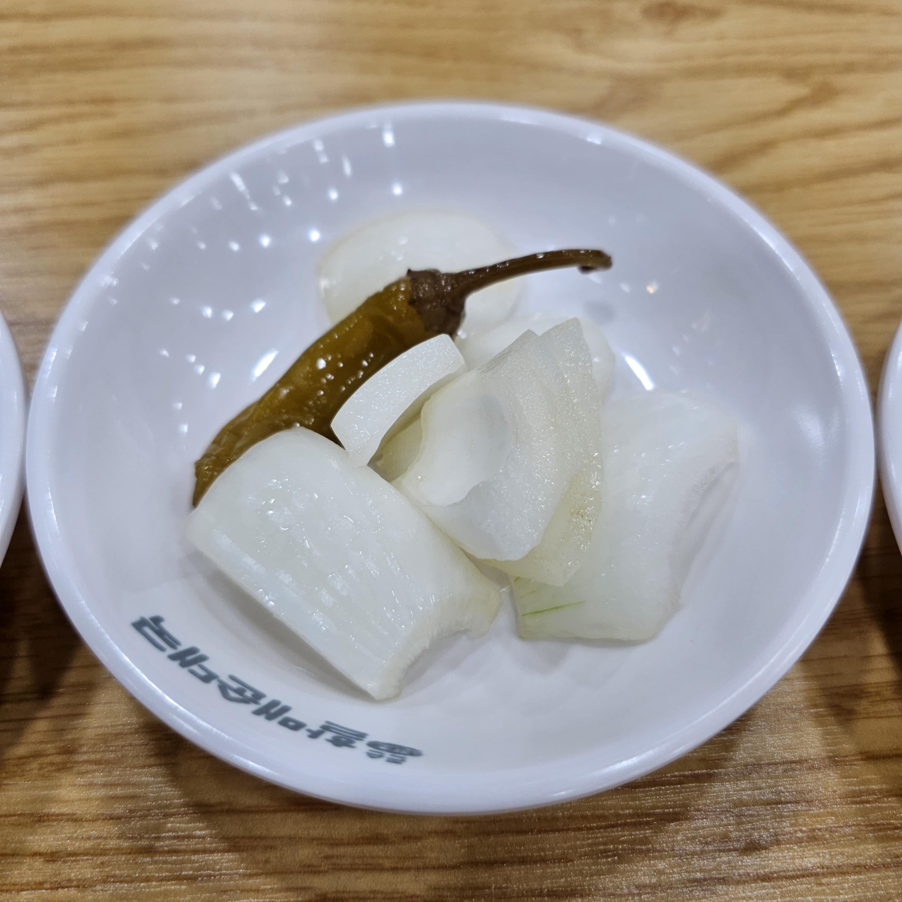 기본 반찬으로는 깍두기, 양파, 고추, 김치가