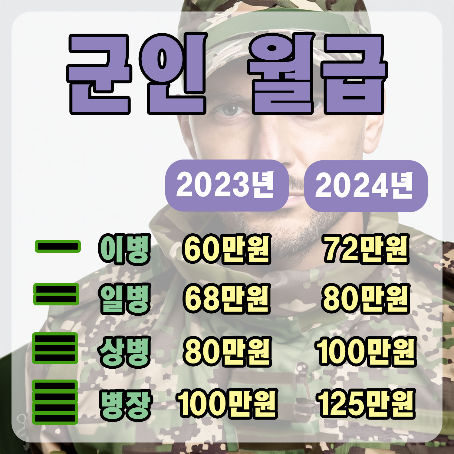 | 일병 | 68만원 | 80만원 |