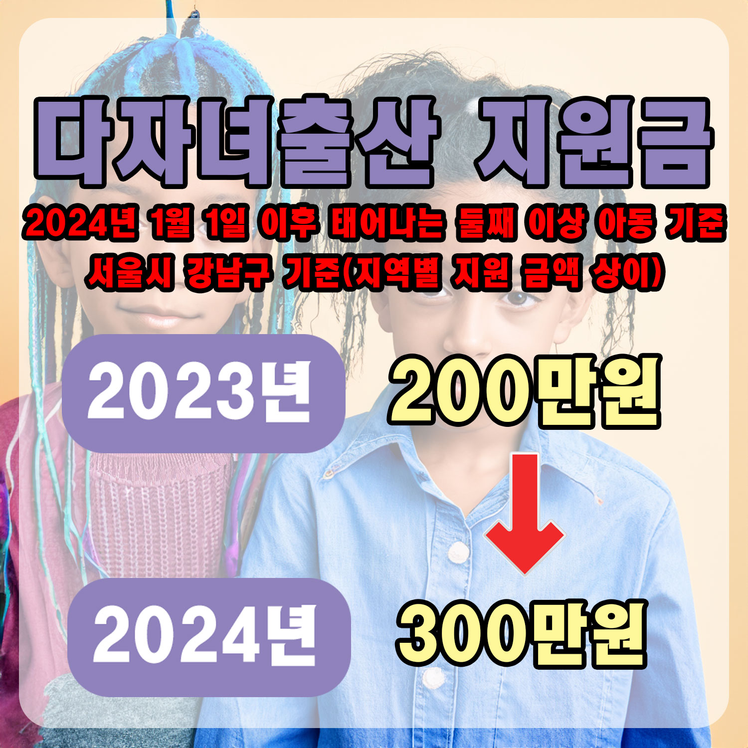 | (2024년 1월 1일 이후 태어나는 둘째 이상 아동 기준) 서울시 강남구 기준(지역별 지원 금액 상이) |