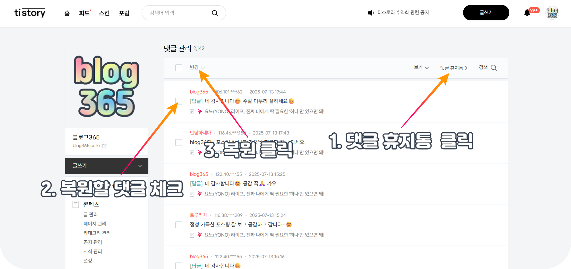 댓글 삭제를 복구 하고 싶다면 '댓글/방명록' → '댓글 관리' → '댓글 휴지통'→"복원할 댓글 선택"→"복원 선택" 을 하면 삭제 된 댓글이 복구 됩니다.